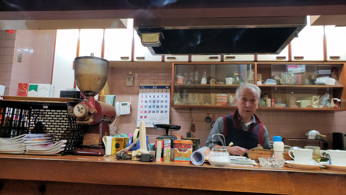 食事を済ませた後、コーヒーでも飲むかということで隣の喫茶店を覗くも混んでいたので帰ろうとしたら4人掛けのテーブルで新聞を読んでいたおじさんが席を譲ってくれた。(け)
