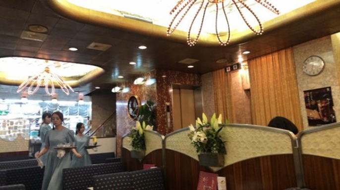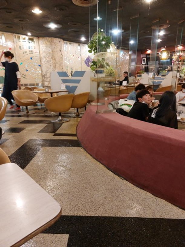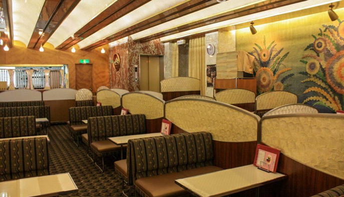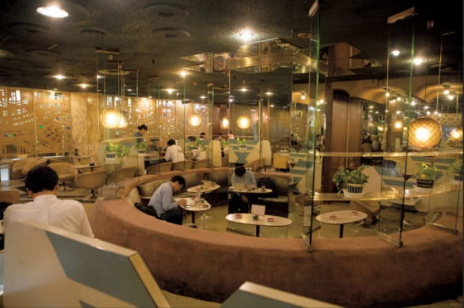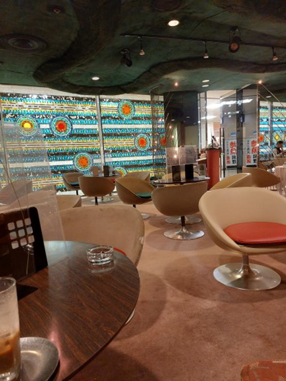 中は宇宙をテーマにした内装。第一ビルが建てられたのが大阪万博(1970)の年。アポロ12号が話題になった事で宇宙への関心が高まっていたからである。元々広い室内なのだが星々をイメージした照明が壁の鏡に反射して異質できらびやかな空間が広がっている。さながら鏡の部屋に入り込んだような錯覚に陥る。中央にサークル状のソファー席があり、周囲を囲むようにテーブル席が配置されている。白のセラミック製のレリーフは近未来の都市、天井の凹凸はクレーターをイメージしているとの事だ。サークル席はちょっと目立つが一度は座ってみたくなるのではないか。