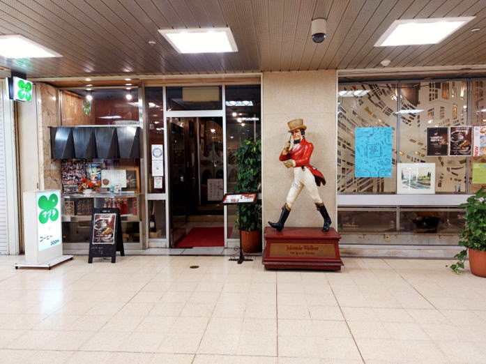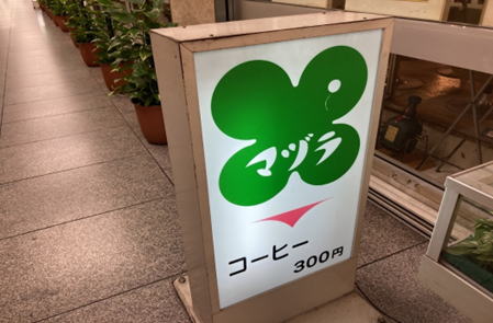 ちょっと変わった名前だが由来はオーナーが若い時に訪れたインドネシアのマドゥラ島からの着想だそうだが店のコンセプトには全く関係していない。まず、入口で目を引くのがジョニーウォーカーのトレードマークであるストライディングマン(闊歩する英国紳士)だ。上の看板には「Tea room」となっているが左のショーウィンドウの下段にはジョニーウォーカーのボトルが並んでいてBARとしても営業しているのがわかる。デザインに興味があるので看板もよくチェックするのだが緑のクローバーがレトロっぽくて可愛い。それにしてもこの手の店でコーヒー300円は安い。