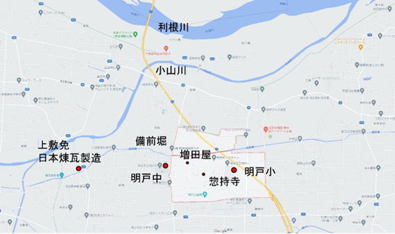 左大○:明戸中学校 中上小○:増田酒店 中下小○:惣持寺 右大○:明戸小学校