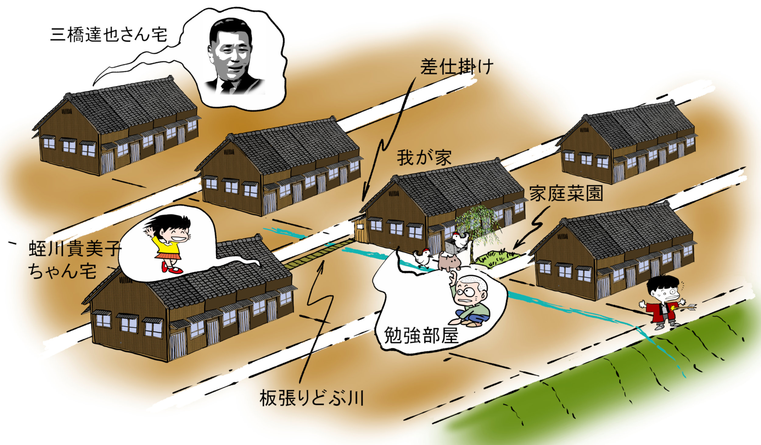 長屋の俯瞰図ですが絵のような感じです。蛭川さんの棟の先にももう一棟あって、その先に農業用の堀がありました。小3位の時に水がある6、7月にカエルだか虫だかを取ろうとして落っこちで、浴衣を着ていて溺れそうになり、ずぶぬれで家に帰った記憶があります。