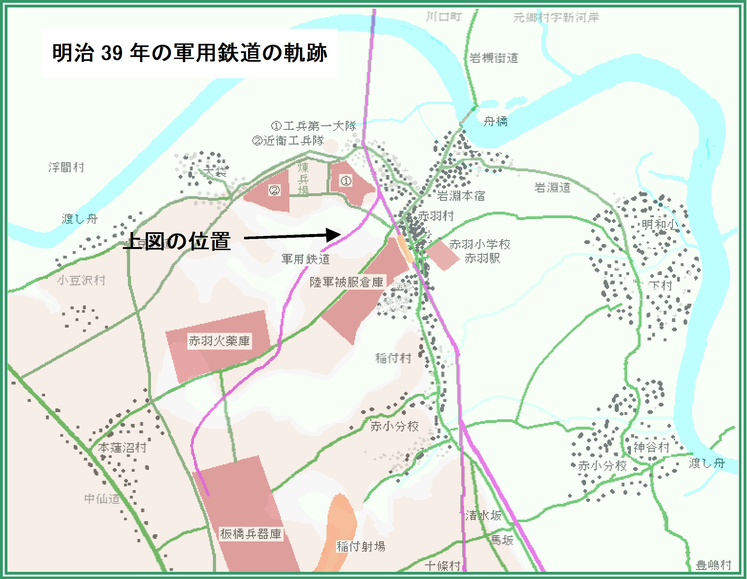 赤羽線をはさんで東の十条側は東京第一陸軍造兵廠となっている。板橋製造所のほかに深谷製造所(埼玉県深谷市)、曽根製造所(福岡県北九州市、当時は小倉市)、宇治製造所(京都府宇治市)、岩鼻製造所、忠海製造所(広島県)、香里製造所(大阪府枚方市)、荒尾製造所(熊本県荒尾市)があった。