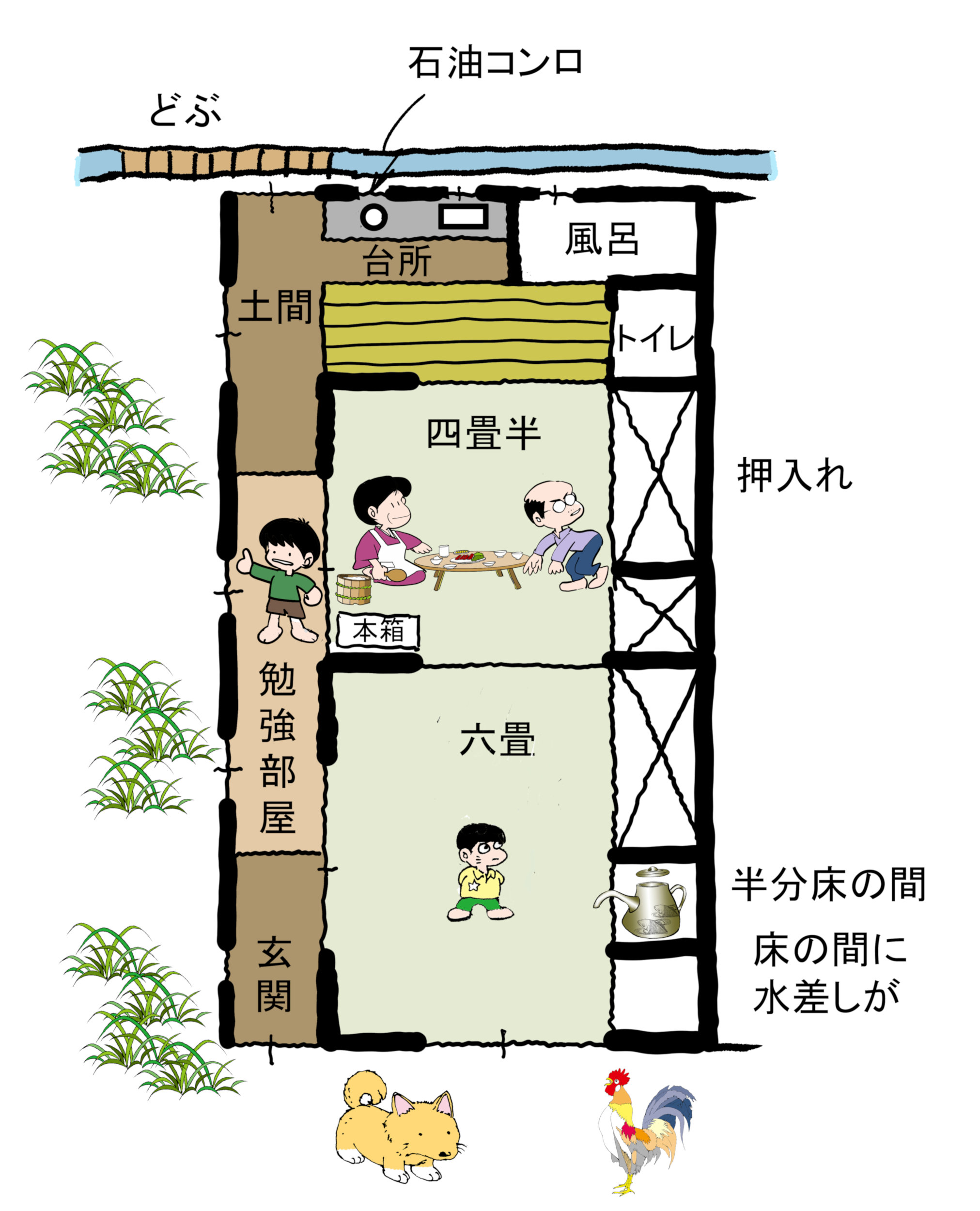 明戸村の間取りとか、住居を挿絵にしてみようと思います。何処まで覚えているかな?2歳半の記憶ですので、後からインプットされた情報も多々ありますね。