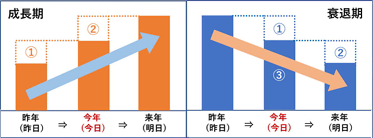 「衰退期」はその逆で、昨日(昨年)出来た事が今日(今年)出来なくなり(ブルー①)、今日(今年)出来ている事も明日(来年)出来なくなる(ブルー②)懸念がある局面です。