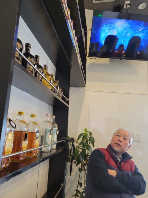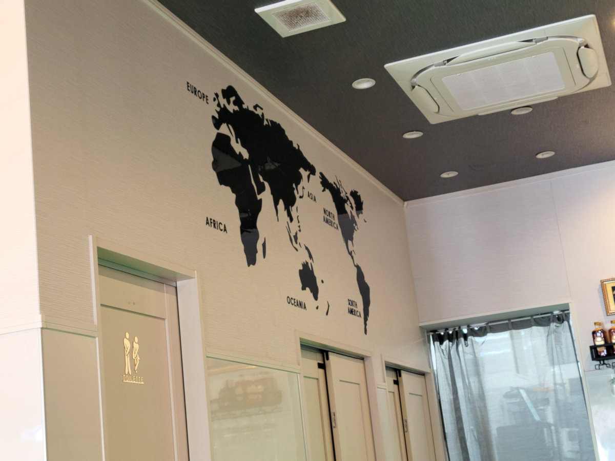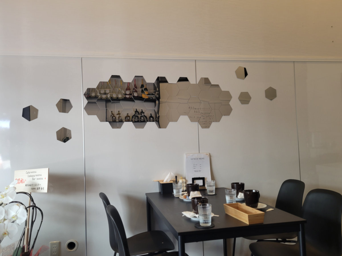 Cafe NANOKA 亀甲ミラーに酒棚が映っている 2025年2月26日