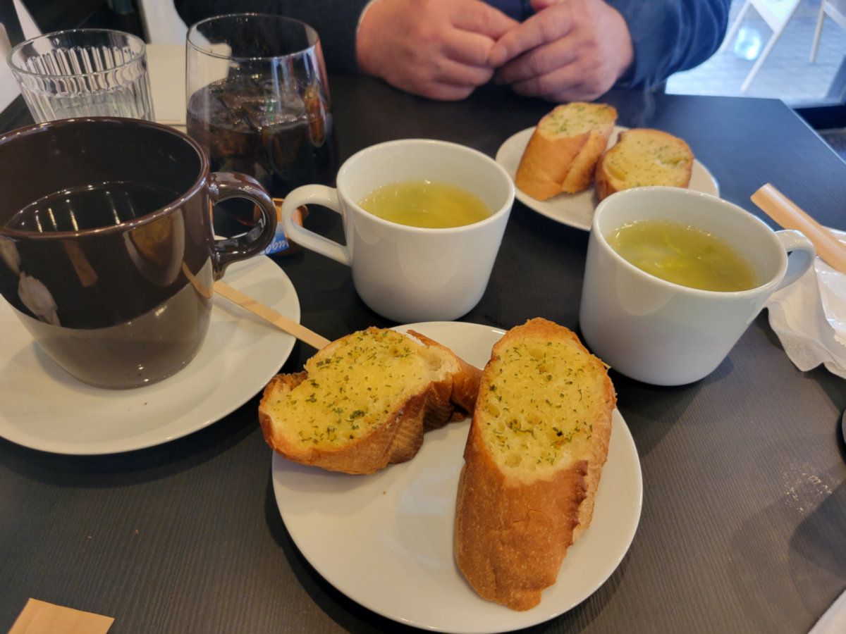 続いてスープとガーリックトーストが運ばれてきます。パンも付いているんだあ。