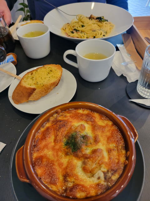「ほうれんそうとキノコの和風パスタ」と「ミートドリア」のランチセットを頼みました。