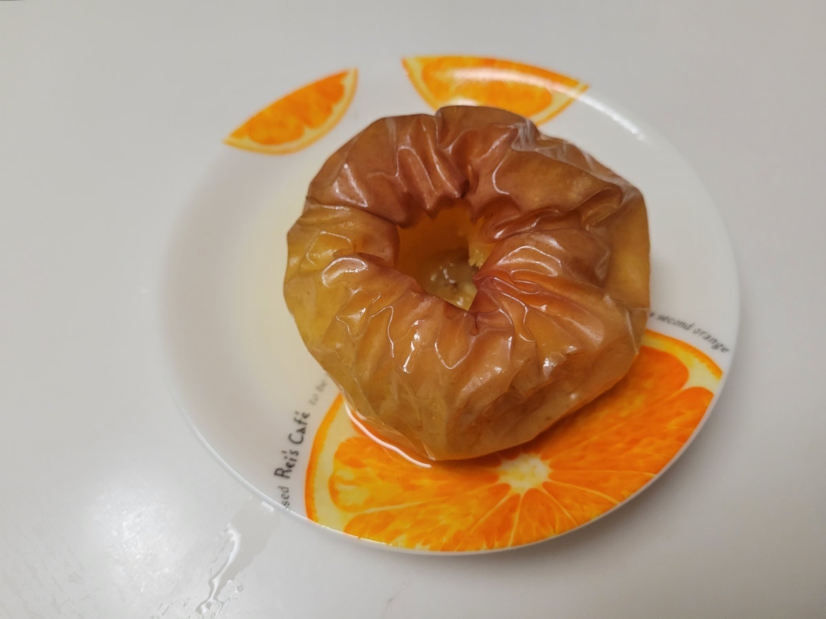 見事に焼林檎らしきものが出来上がります。林檎の蜜がお皿一杯に溢れます。なんと電子レンジの回転皿にも蜜が飛び散っています。よく見るとお皿の底まで付いていて蜜が零れています。後でお掃除しなくちゃ。