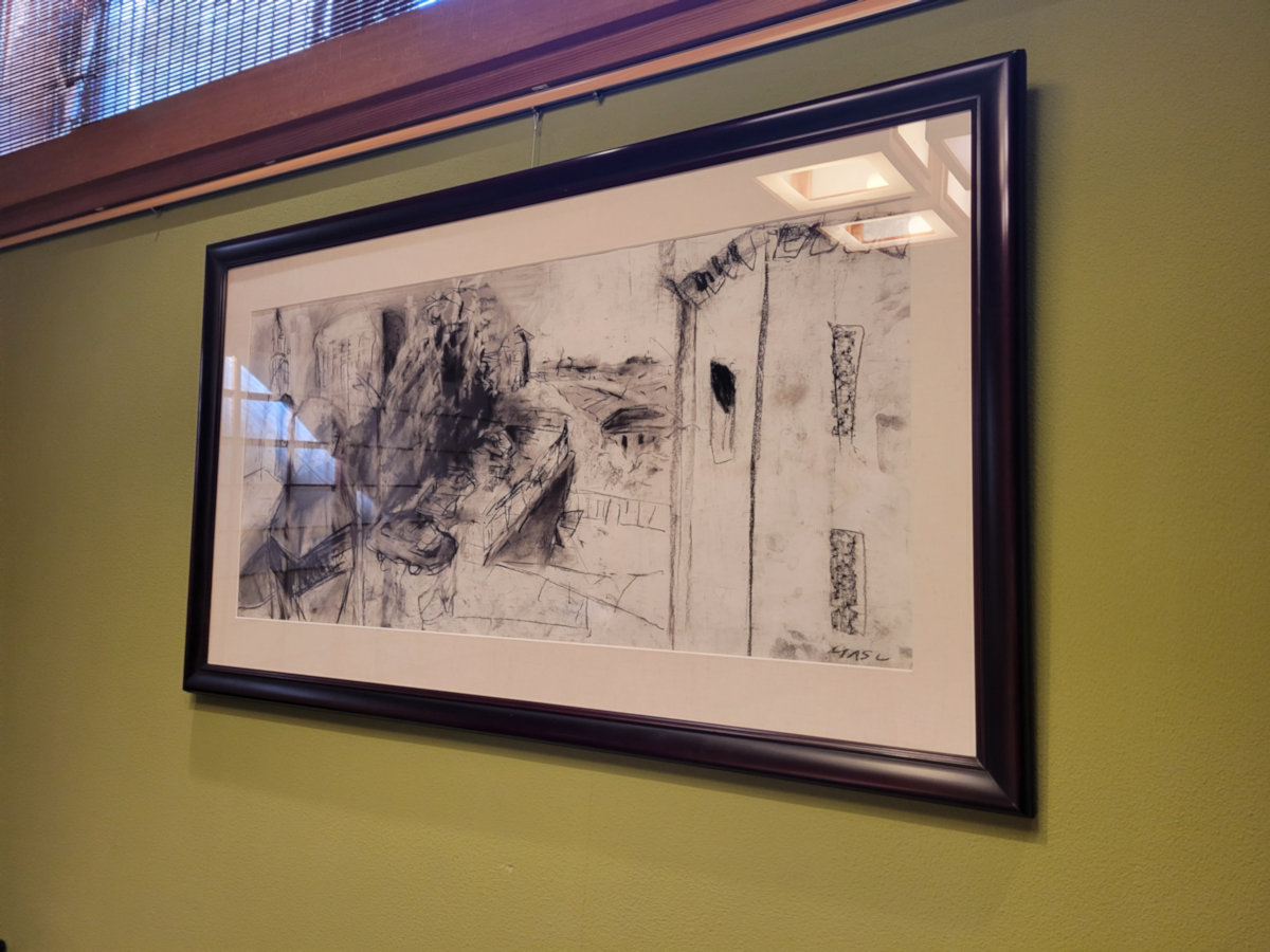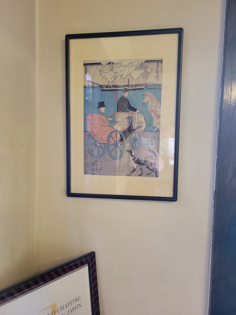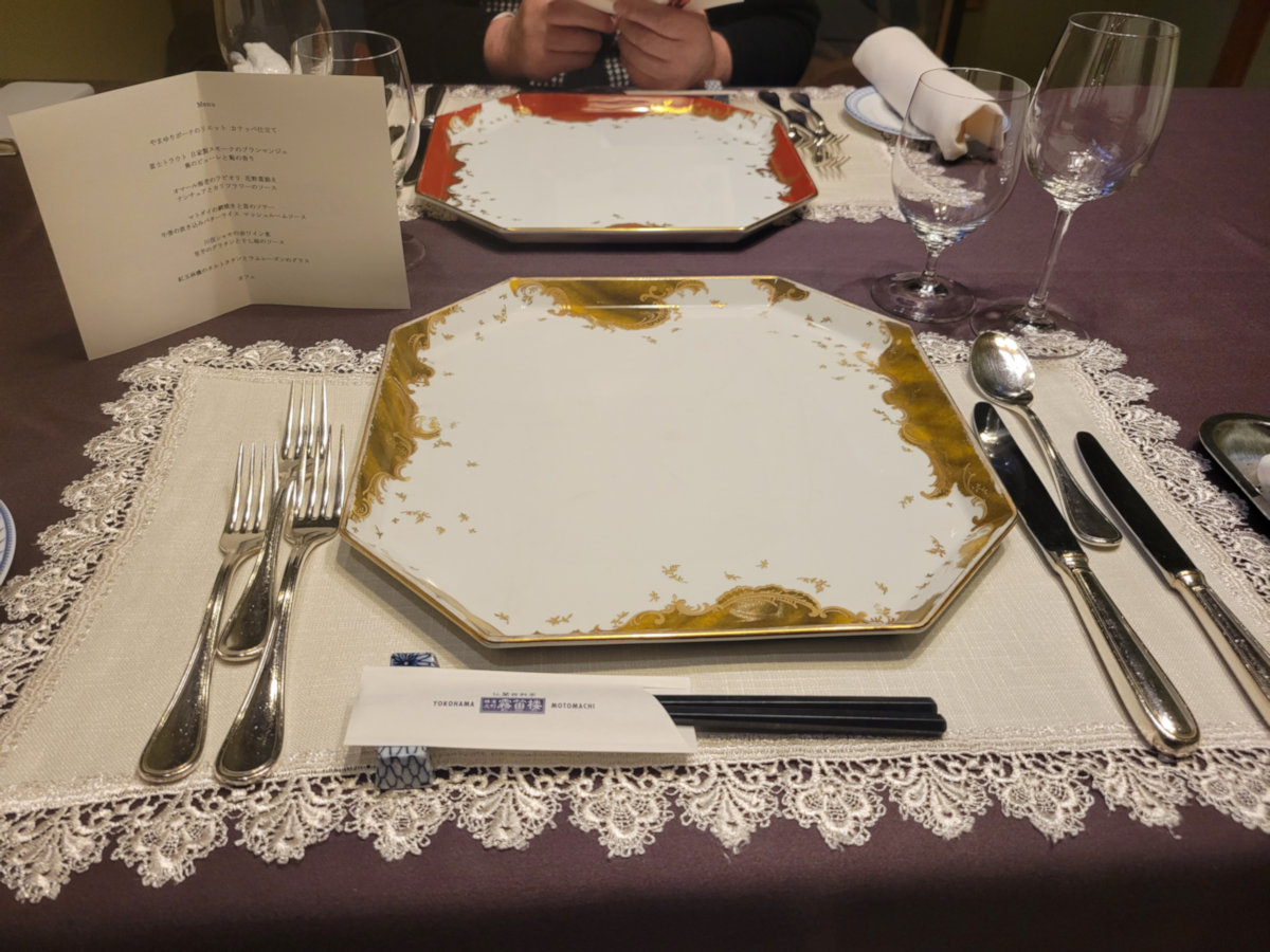 個室に通されました。六畳間の和室に食卓が置かれていて椅子に座って食事をします。幕末から昭和初期までのスタイルでしょうか。壁には横浜港らしい墨画が掛けられています。落款はよく分かりませんでしたが「MASU」と読めるサインがありました。