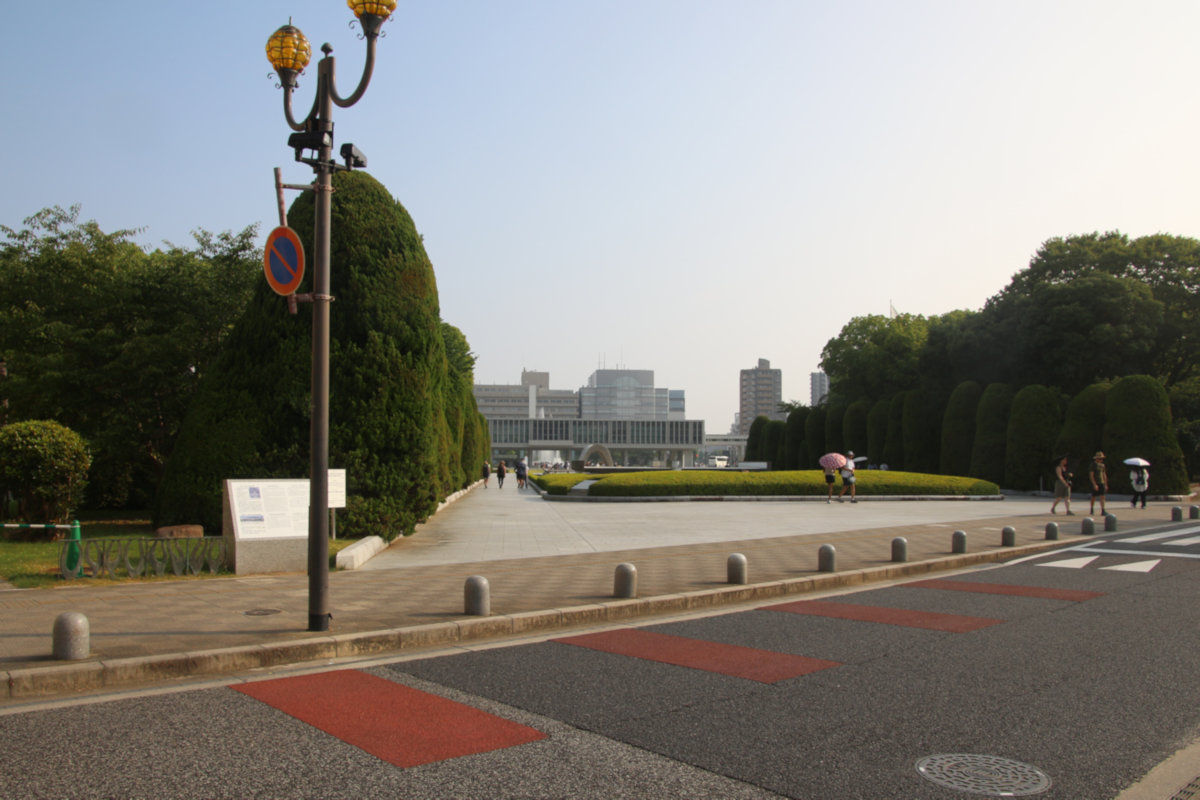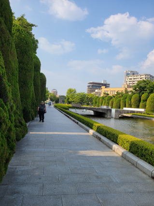元安橋のドーム側から原爆死没者慰霊碑を見ると意外に距離があることに気づきます。遊歩道の幅をゆったりと取って、相互の視線を遮らないように工夫されているのも感心してしまいます。