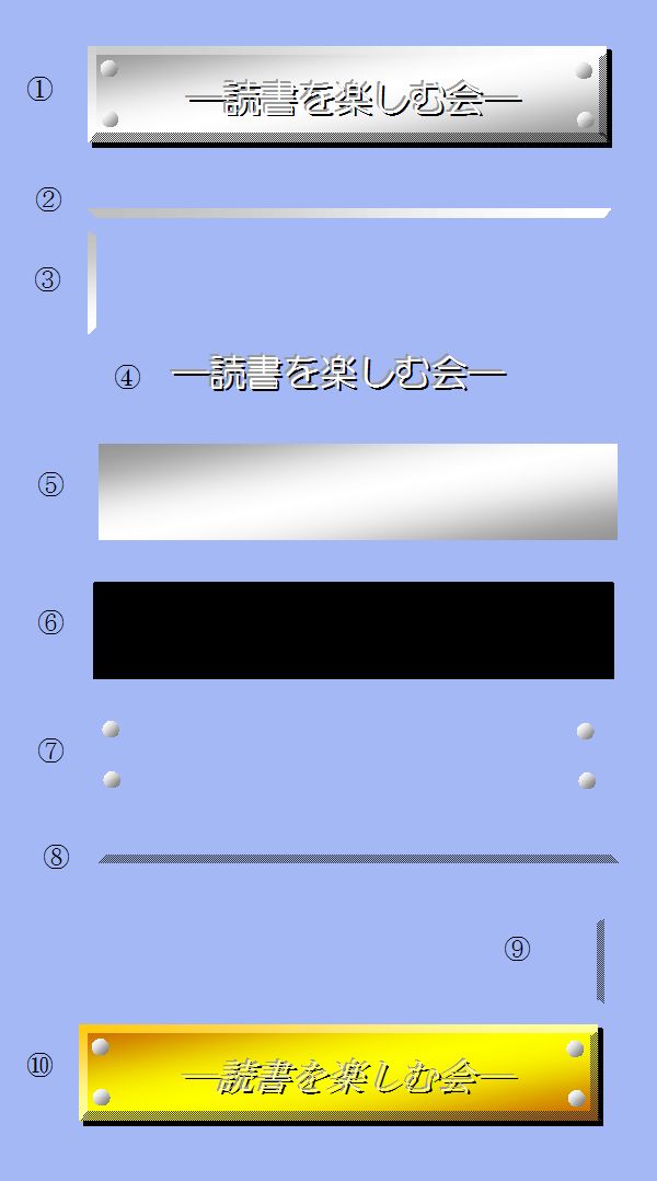 作り方は簡単!左の絵の⑥をまず敷きます。これは図形の四角を使います。その上に⑤を載せます。このとき、図形のプロパティ、色と線、色、塗りつぶし効果、グラデーションを選びます。2色で白と灰色を選びます。灰色はなるべく薄い色がいいようです。