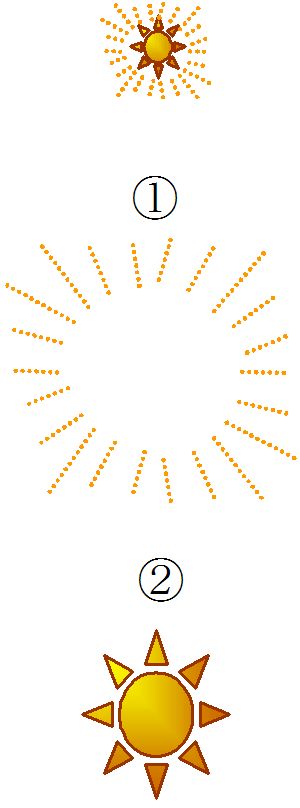 アニメーションGIFにするには、①のきらきらバージョンを四つくらい用意し、②を90°くらい回転させたバージョンを4つくらい用意し組み合わせフレームを作ればよいですね。