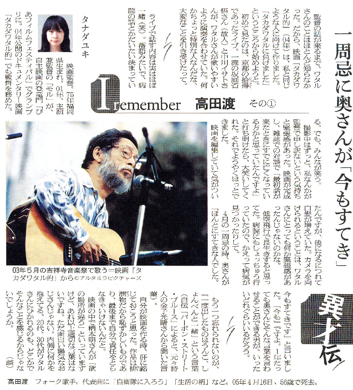 高田はこの「タカダワタル的」(監督:タナダユキ、狂言回し;柄本明)により、若者の層にも高田渡が知られ始める前に、2005年4月、公演先の北海道で帰らぬ人となりました。享年56歳でした。