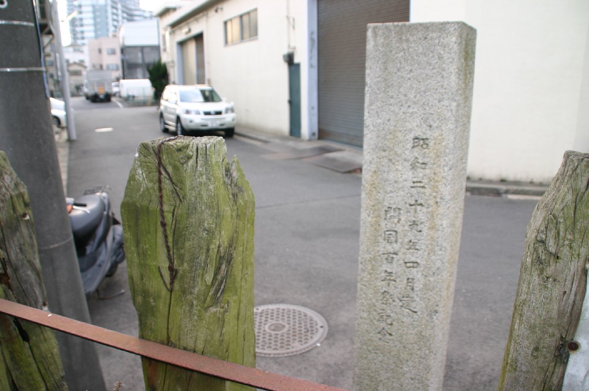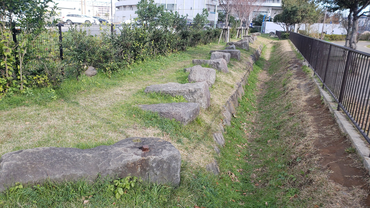 発見されている所は、碑の建っている元は海だった西の際と、その北側に位置する西取渡り道の一部(台場公園の処)と東南の端の高層住宅の開発を行う際に仮設の駐車場で石積が発見された処の3箇所です。