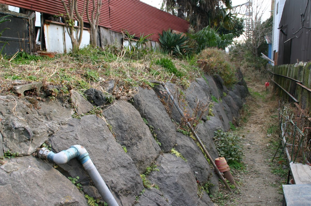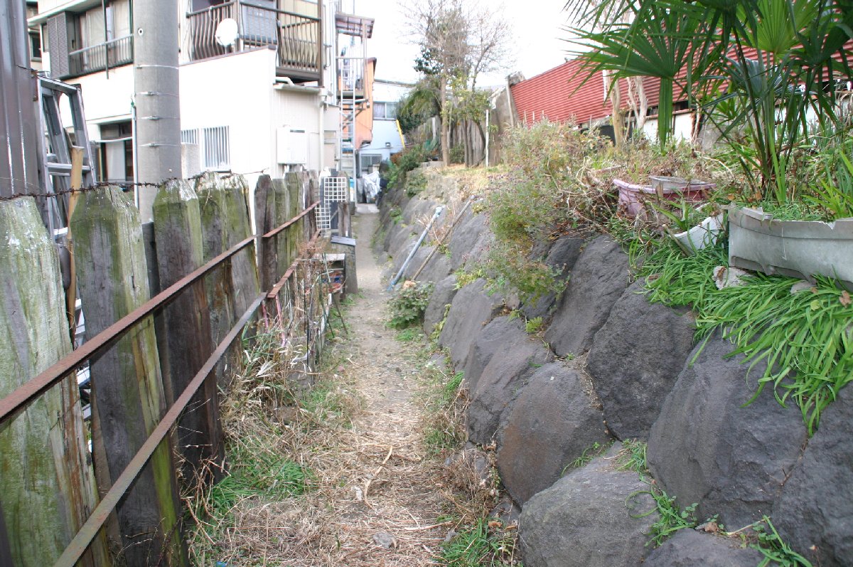 開港資料館に保存されている江戸から明治にかけての地図(前掲)には、砲台の敷地の形状が異なって書かれています。この砲台は、関東大震災やら大東亜戦争などにより、海が埋め立てられ人家が建ち、今ではその敷地を見ることも出来ません。この西取渡り道の石積が見えた場所を探しに行きました。