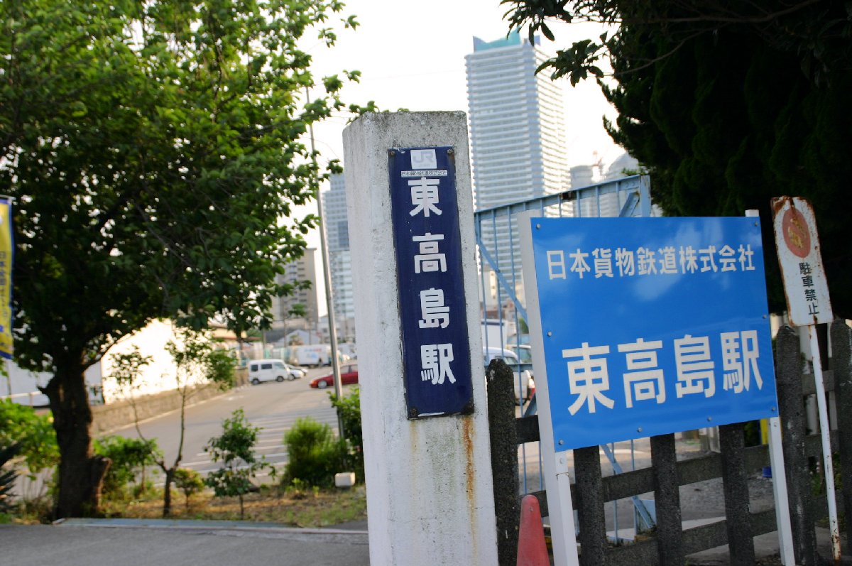 散々探し回ってみると、漸く貨物線の「東高島駅」が見えてきました。駅入り口の前には、おおっ、「鉄チャン」だったら泣いて喜ぶ廃線跡が・・・。