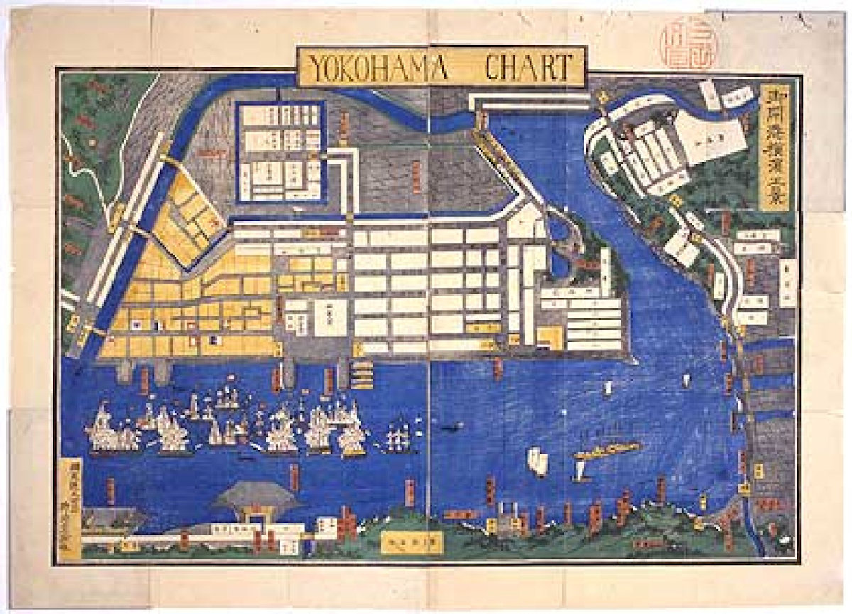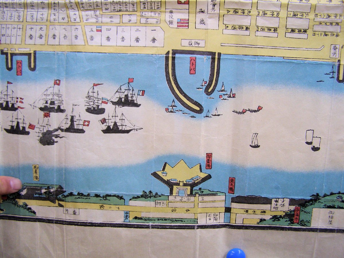 「図は「御開港横浜正景」と言い、横浜開港資料館に所蔵されているもので、幕末に刊行された地図です。下方の海中に突き出した五角形の構造物が神奈川台場で、市街地が外人居留区を含めた開港場だったところです。東京湾の内にお台場が築かれるのは、西欧諸国の黒船が日本の沿岸に現れるようになってから、幕府は防衛のためにお台場を築き諸藩に対してもお台場の築造を命じました。