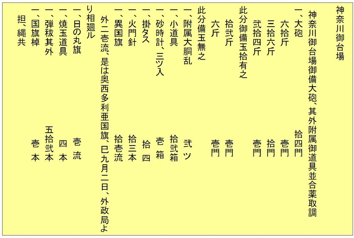 『東京日日新聞、明治十四年(1891)2.9.』の記事に、「神奈川砲臺 これまで神奈川の砲臺においては、大砲の据方の適当ならざるため、傷害を被むりし者あること既に三四回におよび足れば、今ど陸軍省にていよいよ据替となること決せられ、十四門のうち七門だけに着手なりしよし、又た是までは鋳鐵銃なりしを今度は銅銃とせられたりとか」
