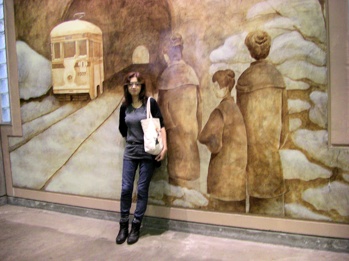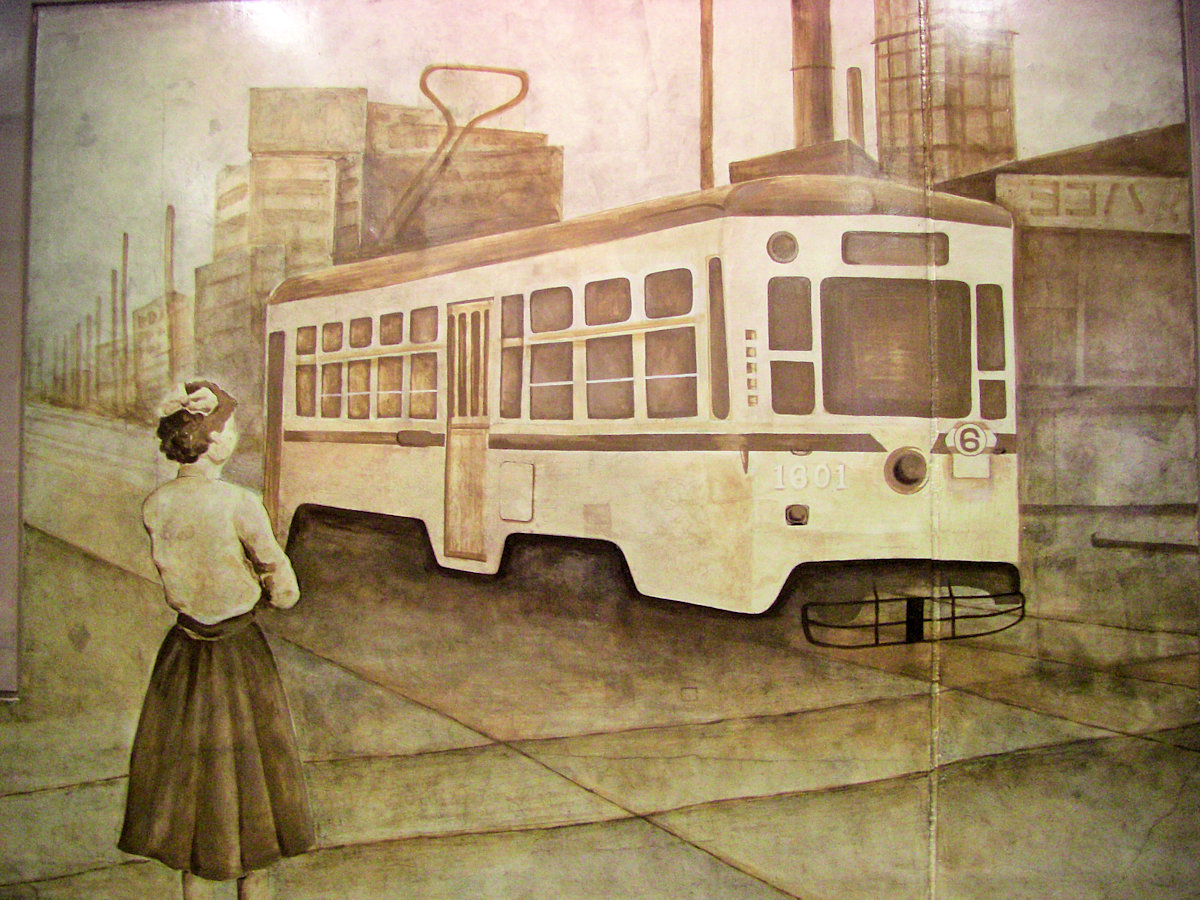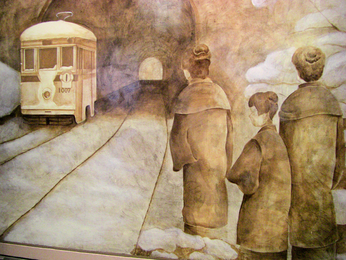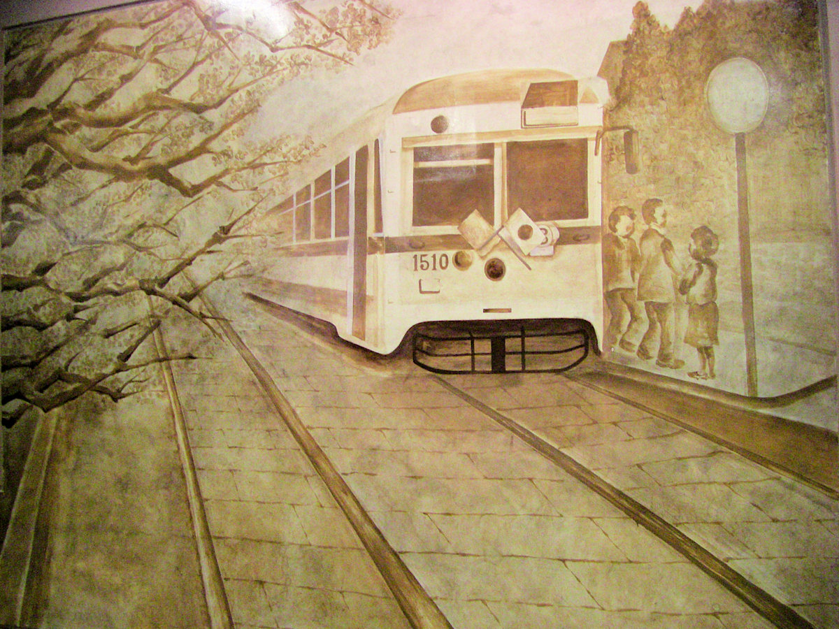 壁画に素朴な市電の絵が描かれています。誰が書いたのでしょう。デッサンは少し狂っていますし色使いも変ですが、不思議と懐かしい雰囲気があります。