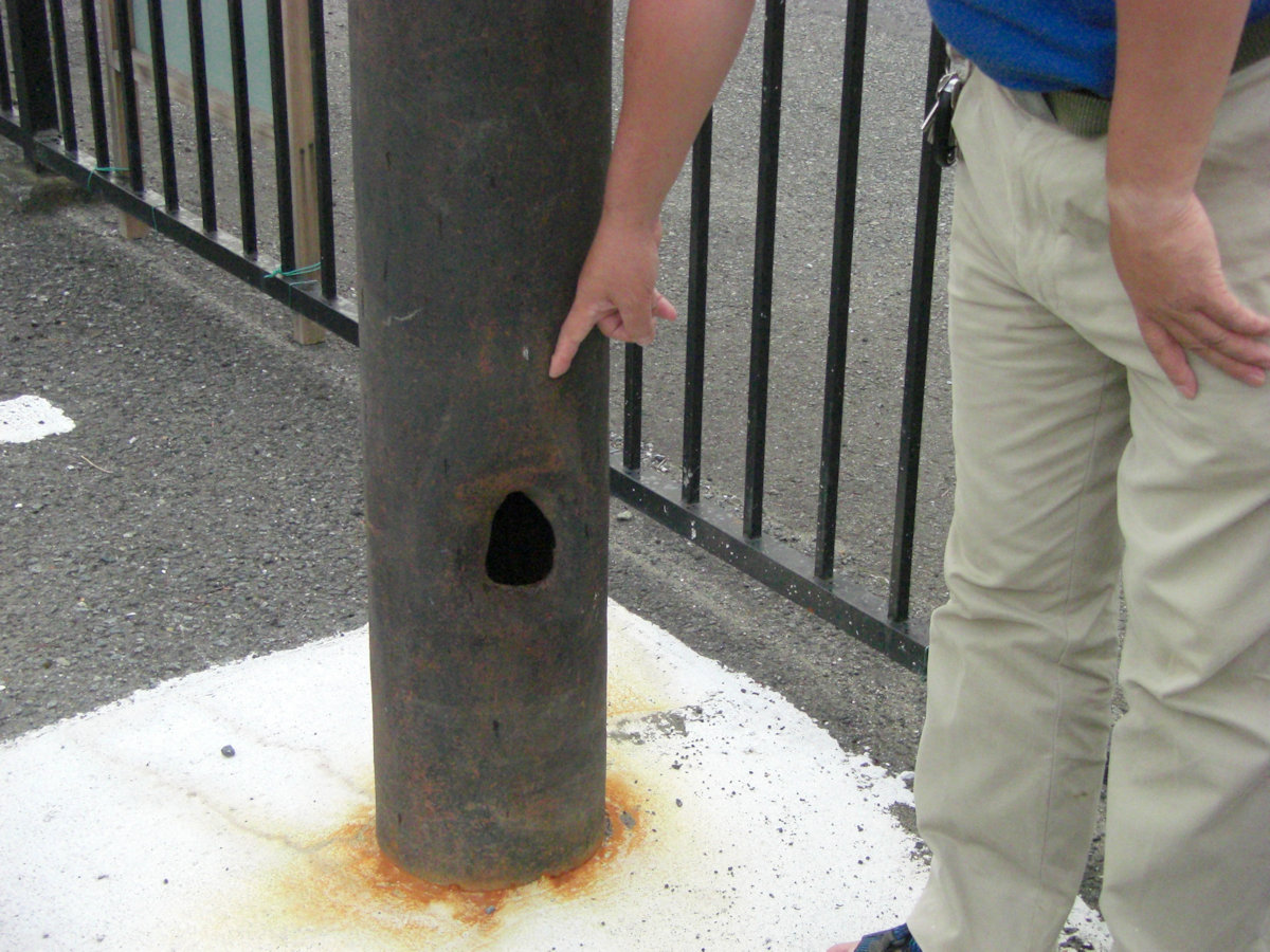 保存館の出口には一本の電柱が立っています。昨年の7月まで子安の国道際にぽつんと立っていました。当時の市電の架線電柱で大東亜戦争のときに、米軍による機銃掃射を浴びせられたようです。その跡が生々しく残っています。