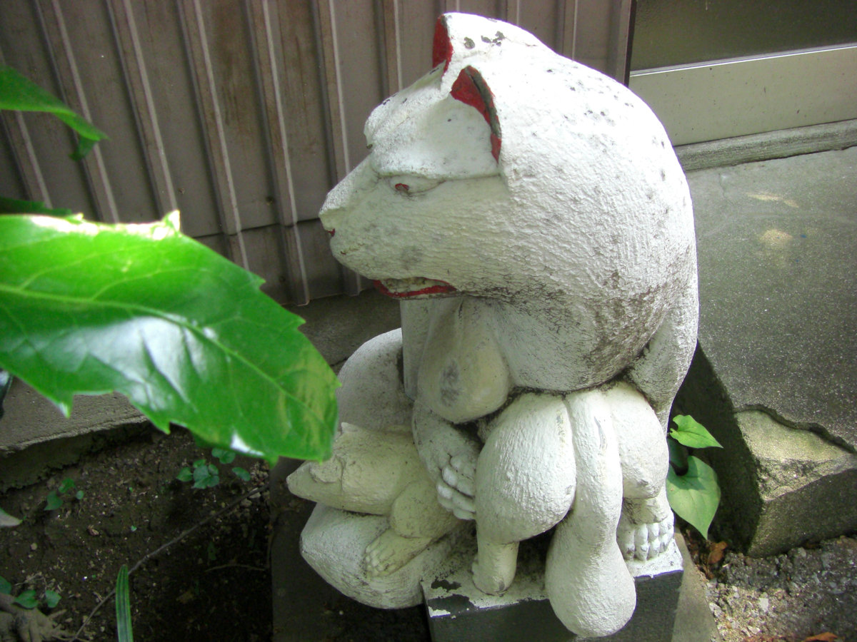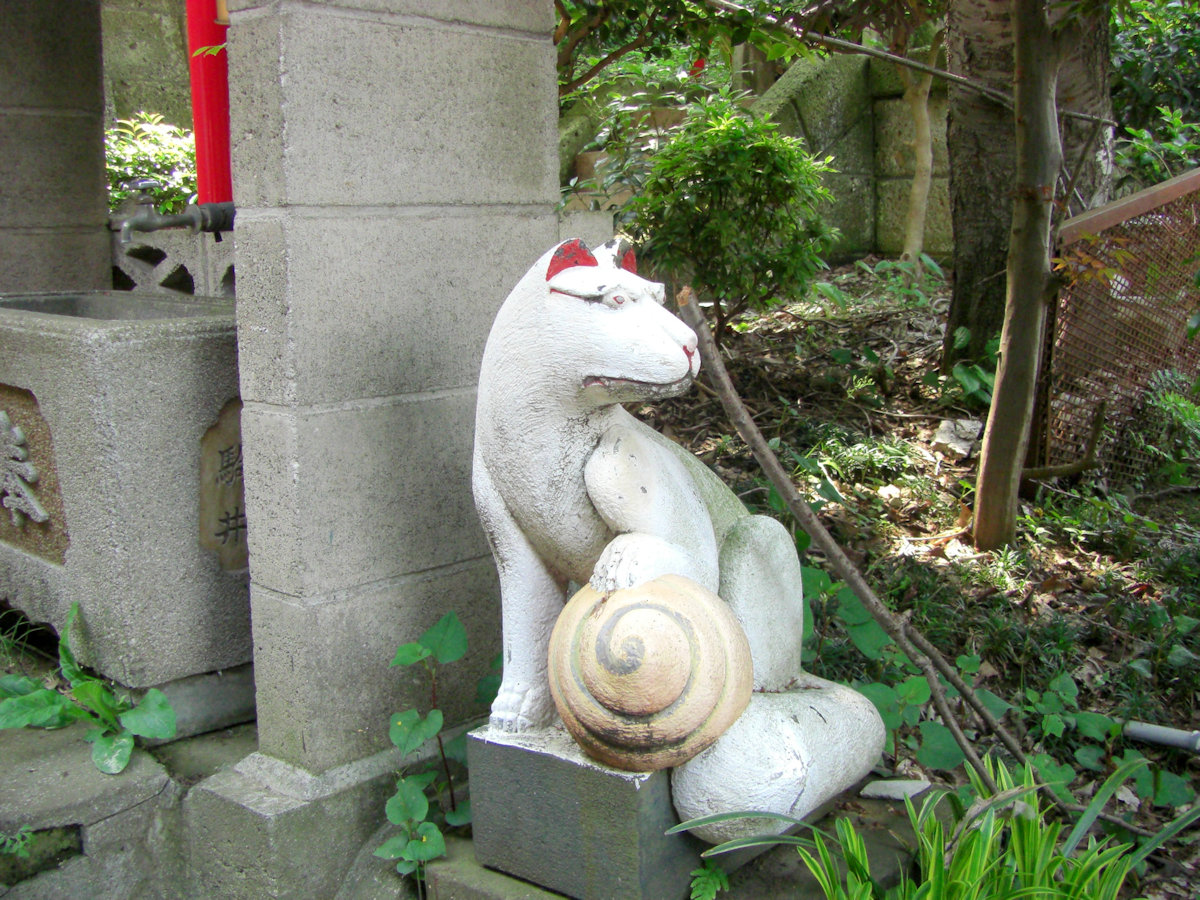 ここのお狐さんは変わっています。腕に大きなカタツムリを付けたものや、子狐を抱きしめているものです。
