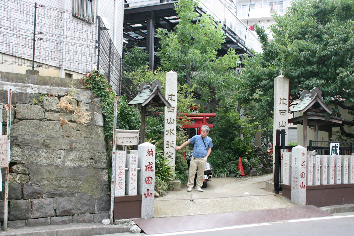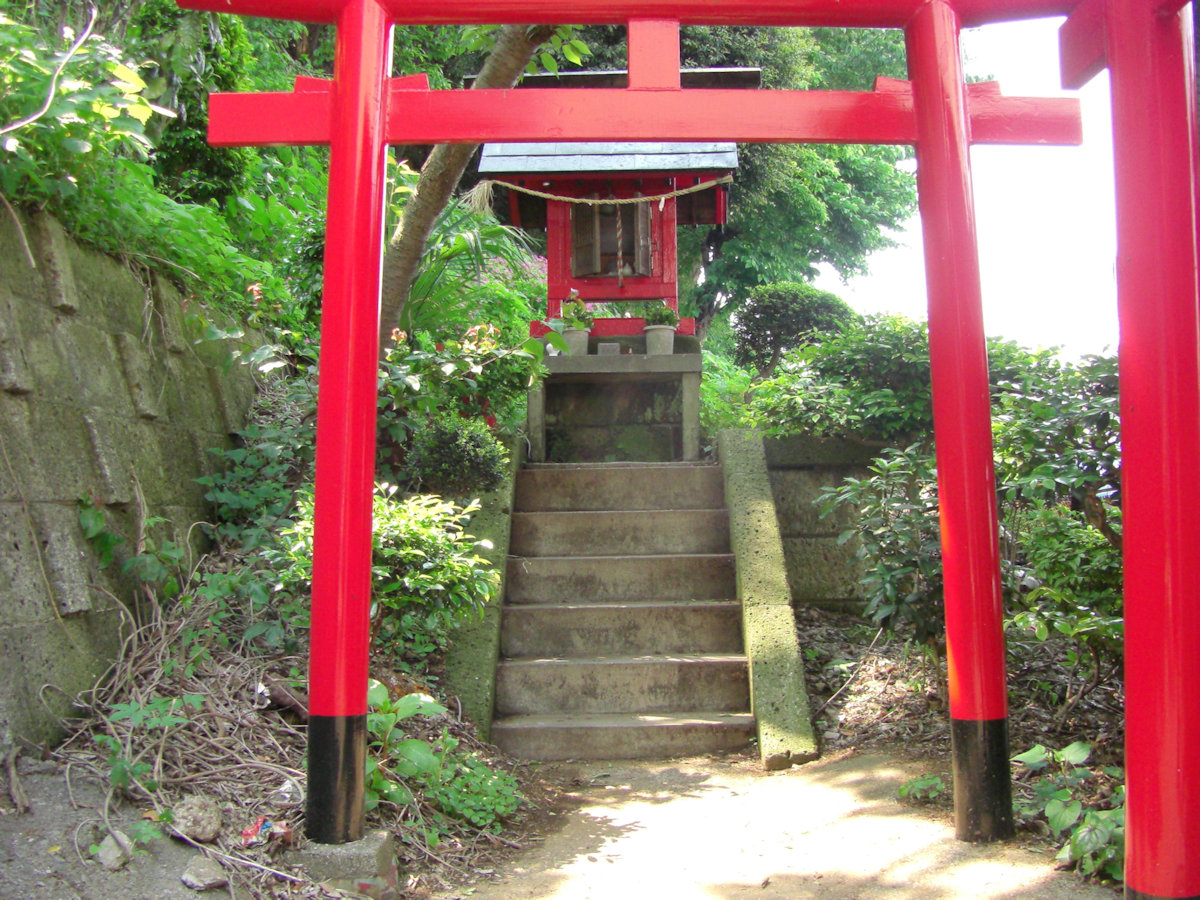 不動尊って言うとこれはお寺さんか?「成田山」って石柵に彫ってあるし、でも、如何見ても神社さんにしか見えない。小高い丘に参道があり、鳥居が囲む。鳥居の参道の上の鉄骨は駐車場の鉄骨だ。以前は入口に成田山七島不動尊の看板が在ったらしい。
