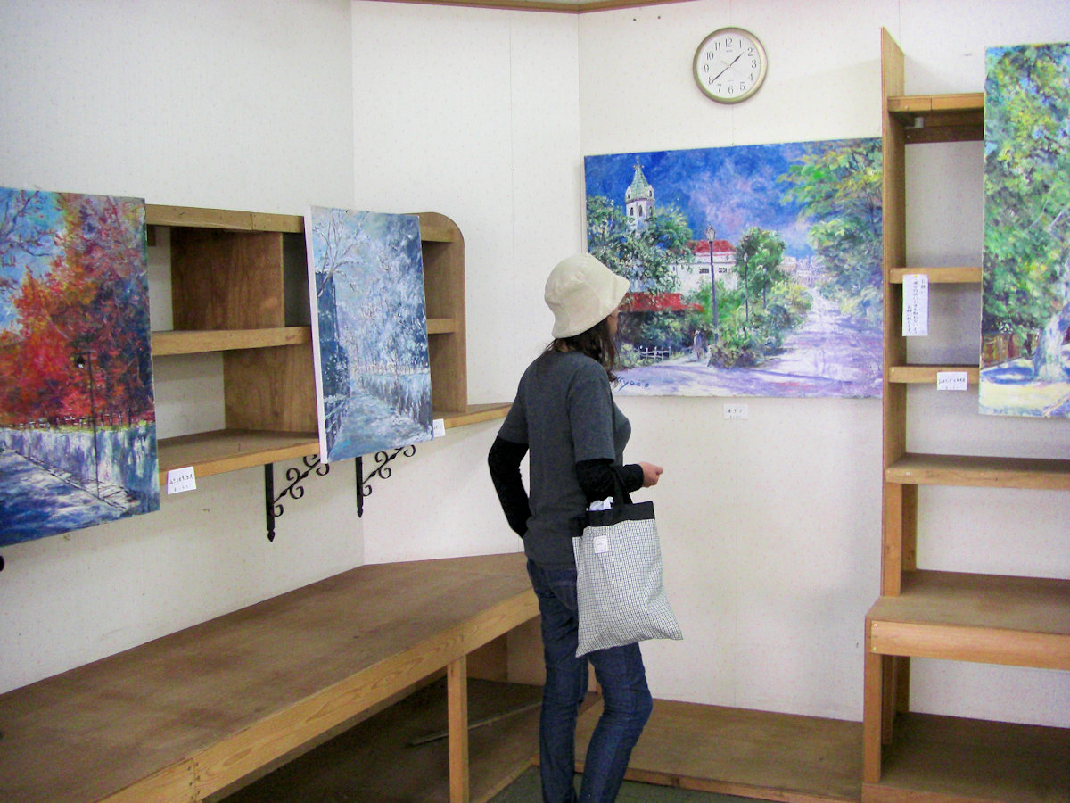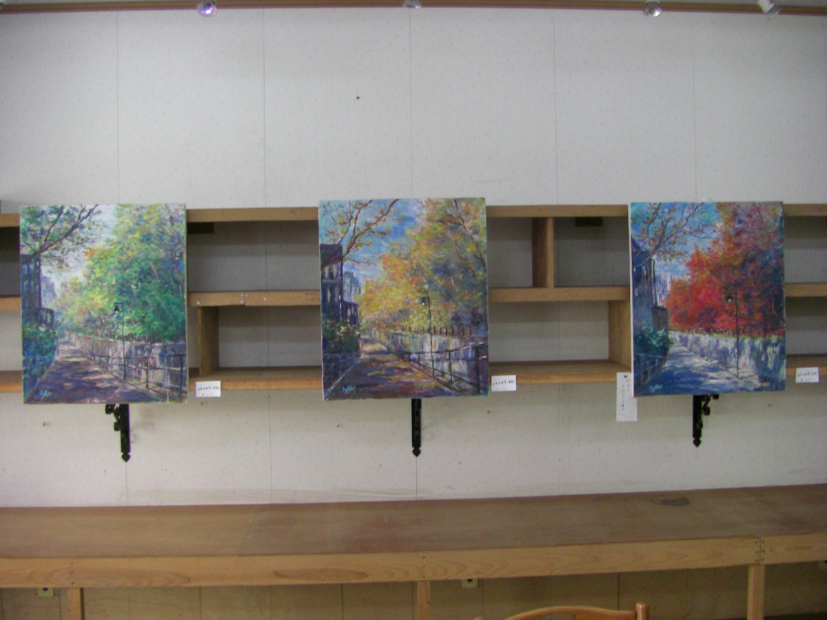 結構な広さの画廊で、以前は衣料品店であったのではと思わせる造りです。今回は油彩が飾られていました。女性の画家さんで年齢は判りませんが、風景画ばかりですのでお年を召した方かなとお見受けしました。