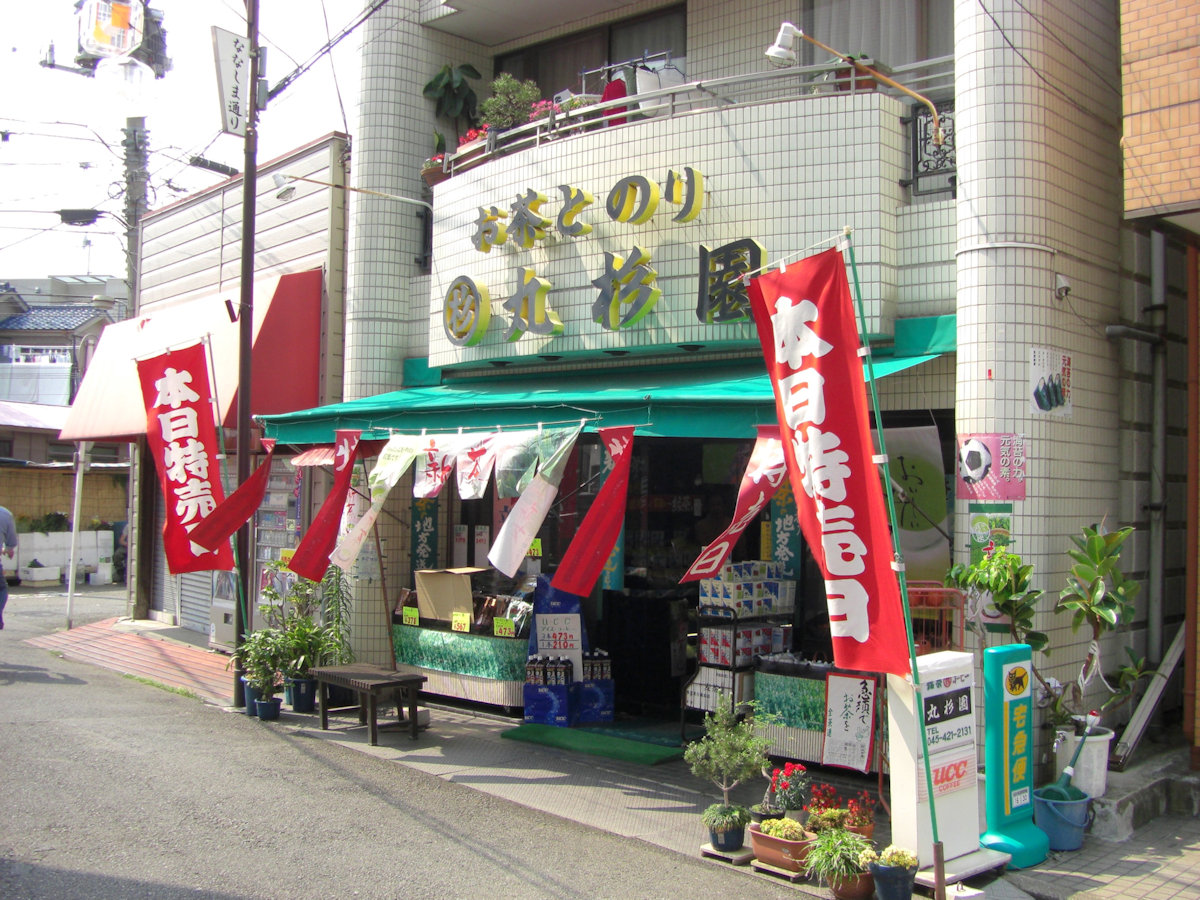 もう一方の町の実力者、「丸杉園」さんです。こちらはお茶屋さん。活気が良く「本日特売日」の旗が・・・。