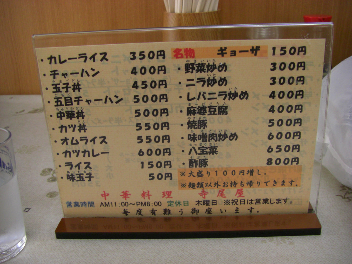 でも、ラーメンと餃子が異常に安い「寺尾家」で食べちゃったよ。ちなみにラーメン300円、餃子6個150円ですよ。なんとも安い安い。餃子はしかもはりはりのぱりぱり、旨い~。でもここは「ななしま商店街」ではなくて、曙商店街の中です。