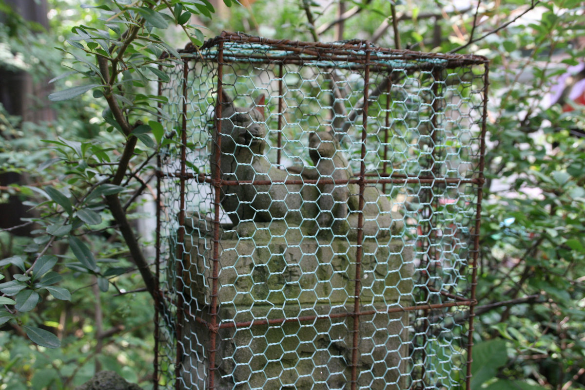 でもここのお狐さんは小柄ながらも細工が行き届いており、毛筋が克明に彫られていた。悪戯されるのを嫌ってか、金網で囲ってあるのが興醒めです。