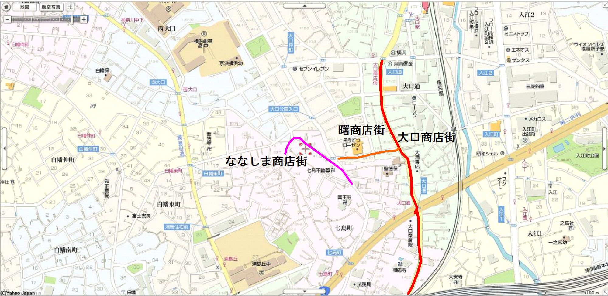 その大口商店街に曙商店街という枝の商店街があり、曙通りの終わった先に更に「ななしま商店街」がありました。