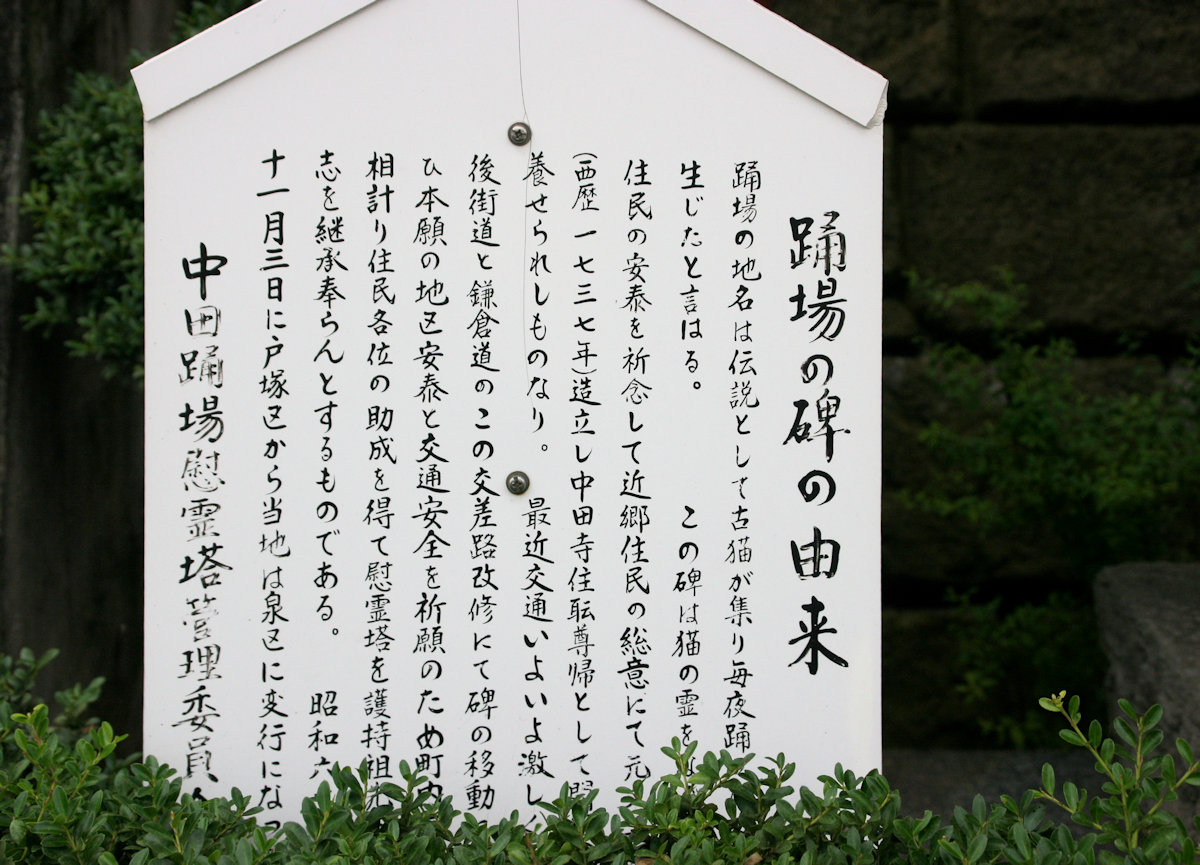 「昔、戸塚宿内に水本屋という醤油屋があり、そこの手拭いが一本ずつ無くなっていきました。不思議に思った主人が調べると、飼い猫のトラが咥えて逃げようとしていました。その訳は判りませんでした。ある夜、水本屋の主人がこの駅の辺りに通りかかると、猫達が手拭いで頬被ぶりをして踊って居ます。