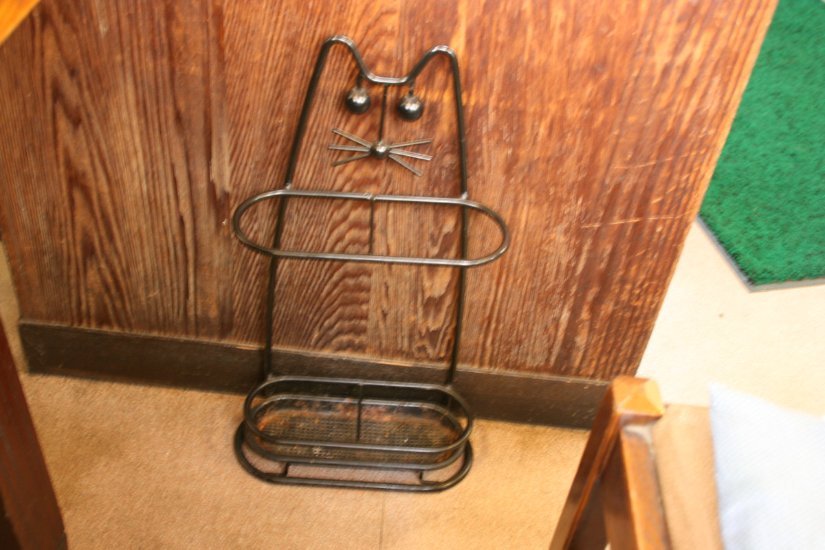お店の中に猫の傘立が置いてあった。だからね、何処が猫に関係しているかと言うと、お店のマスコットを猫だと感違いしていたことと、傘立がそうなりますかね?