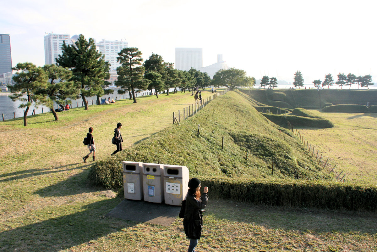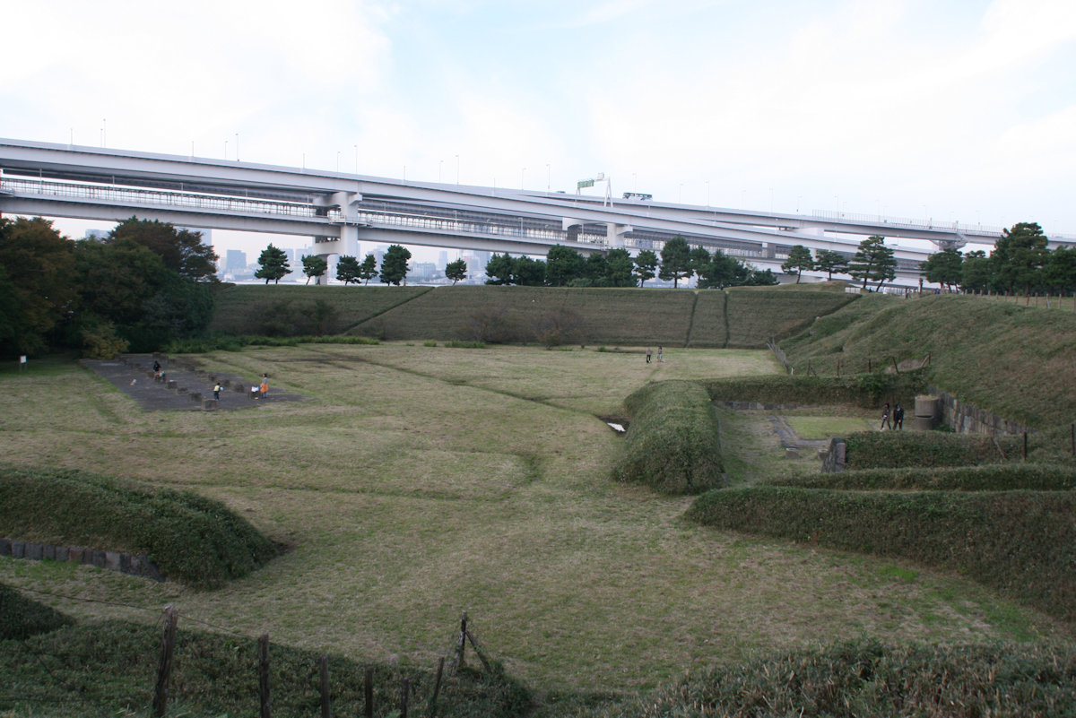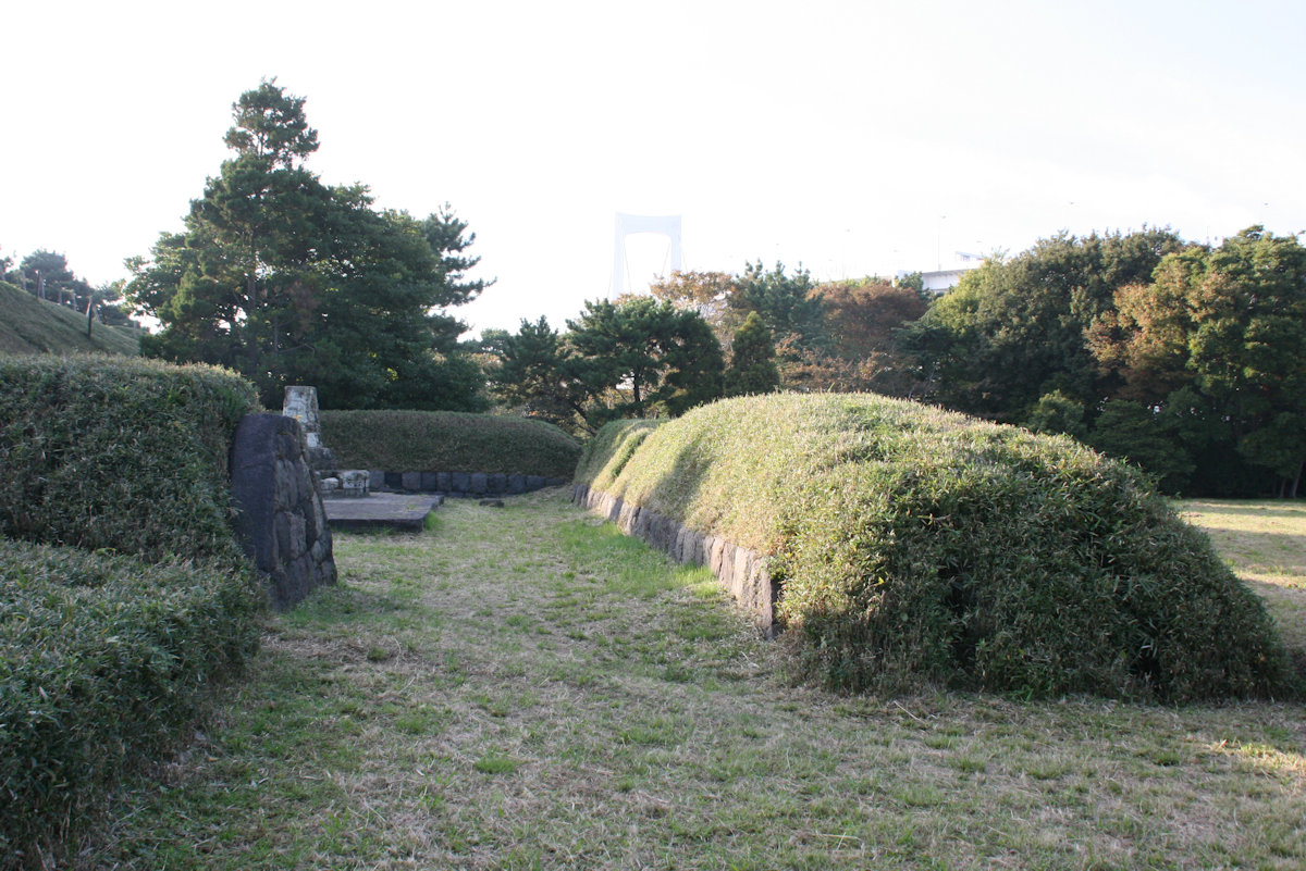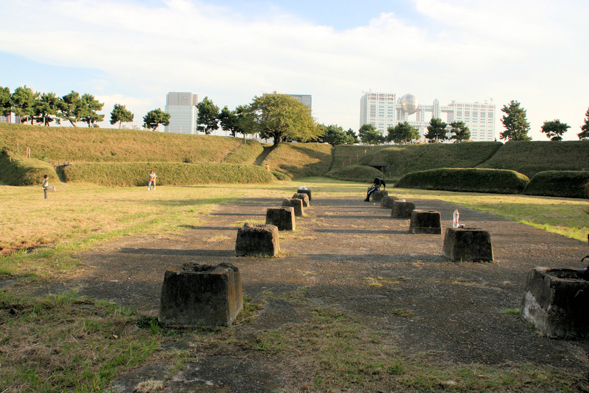 このうち第三台場は、昭和三年東京市(都)によって整備され、台場公園として解放されています。周囲には、海面から五~七メートルの石垣積みの土手が築かれ、黒松が植えられています。また内側の平坦なくぼ地には、陣屋、弾薬庫跡などがあります。