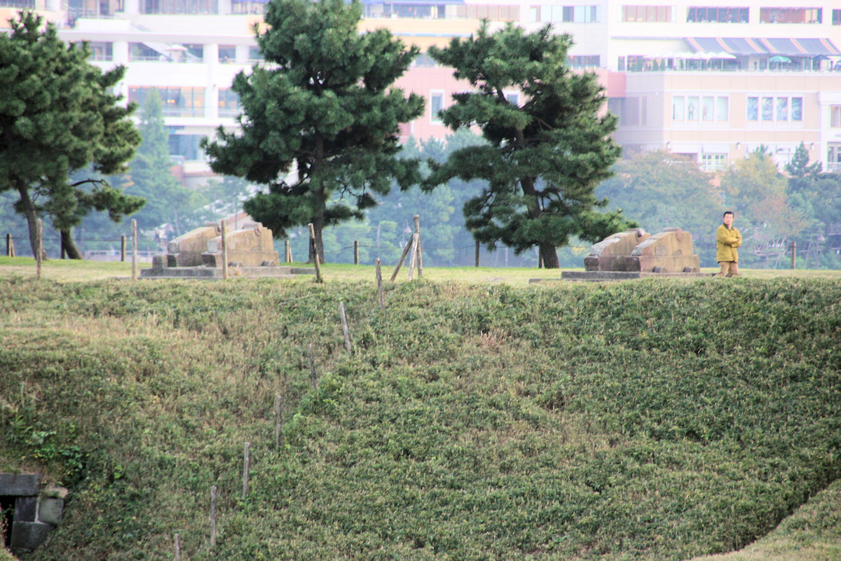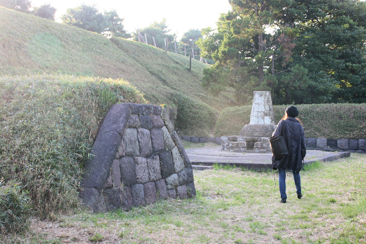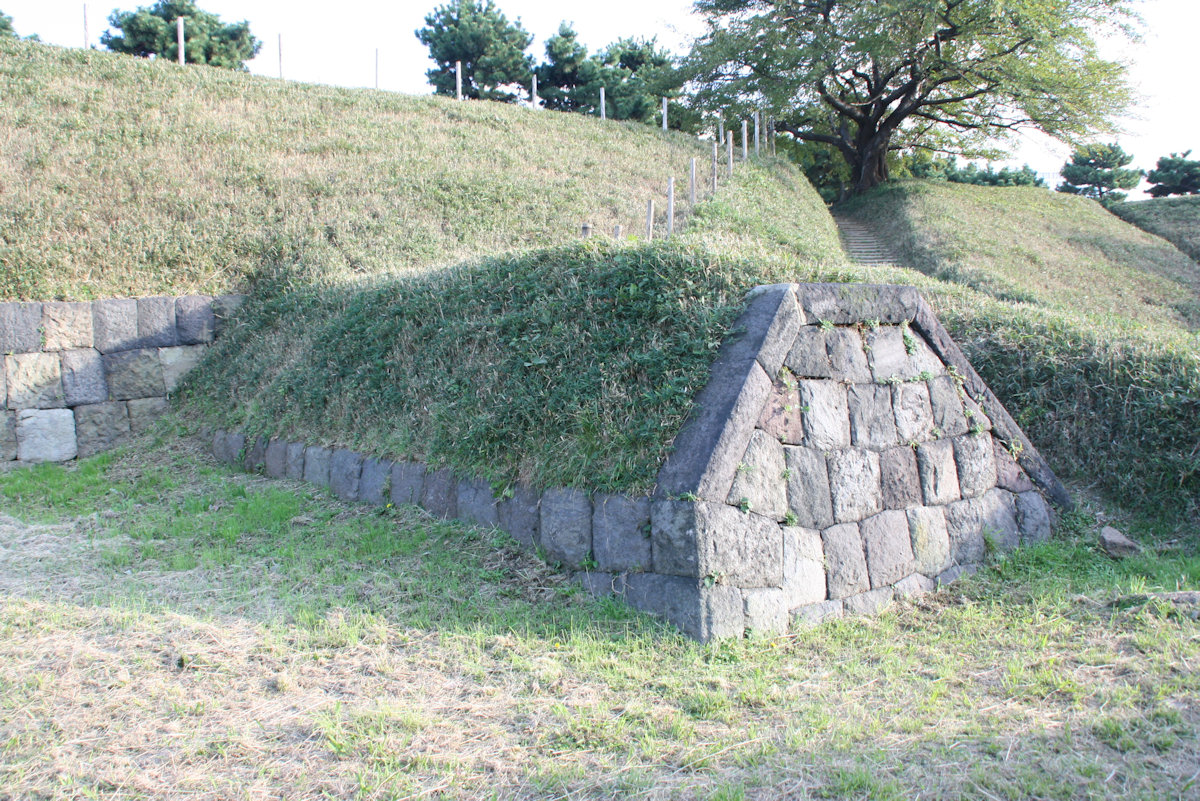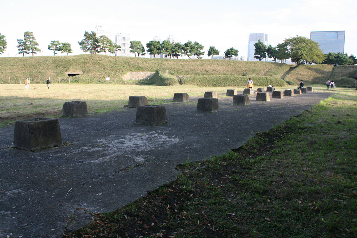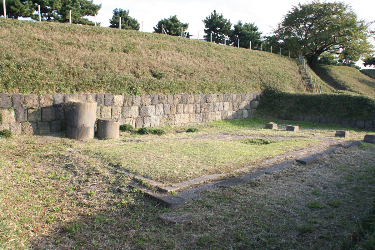 堤の底の広場に並んでいる石は番士休息所(陣屋)跡の礎石だ。土手の正面に弾薬庫跡があるぞ。