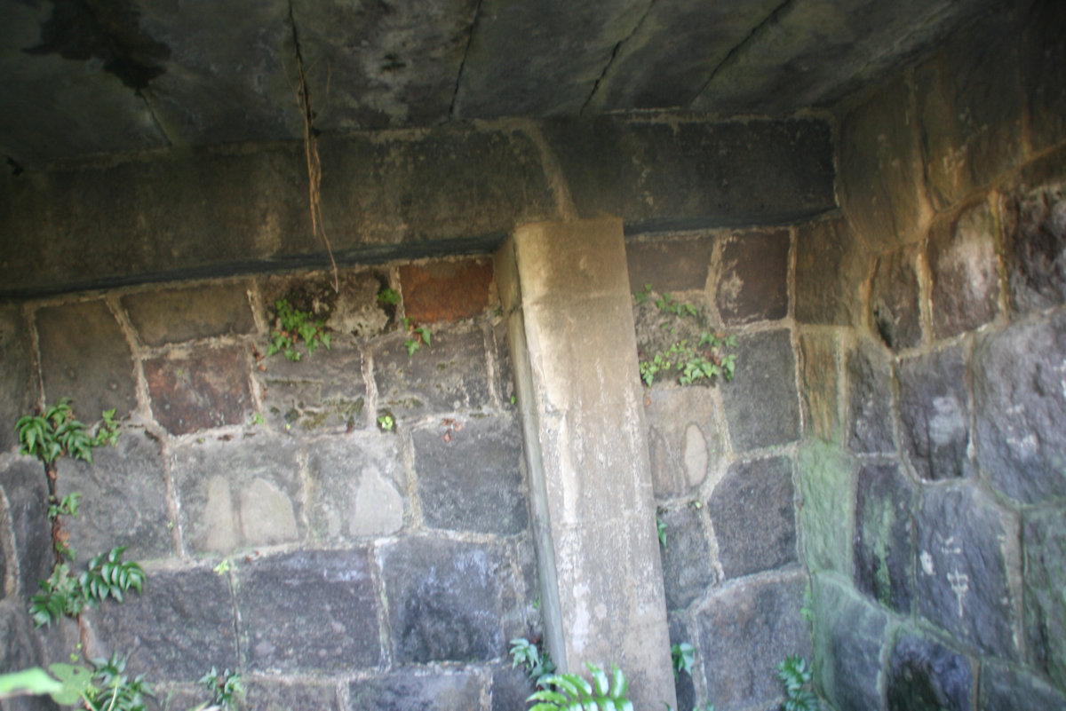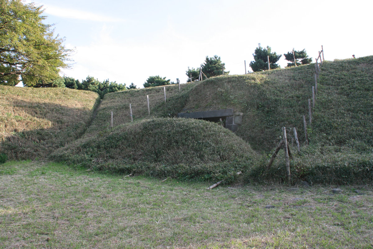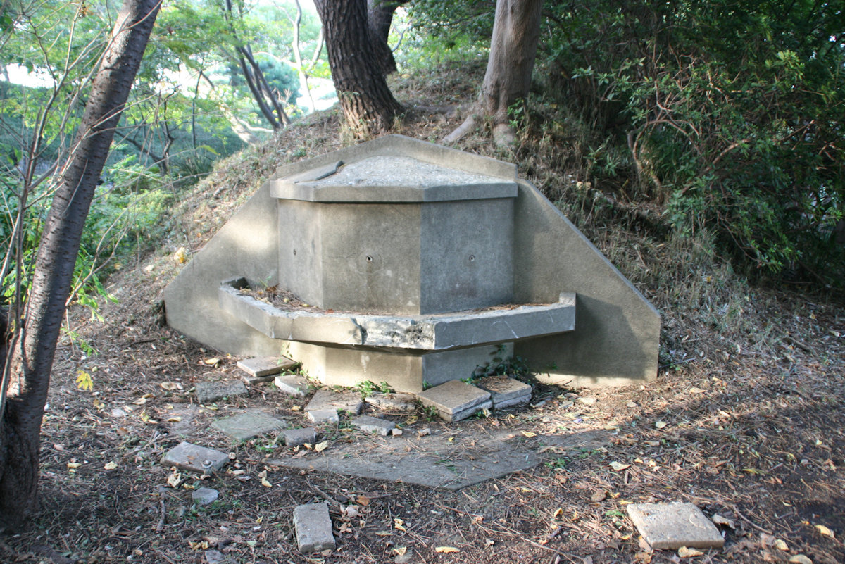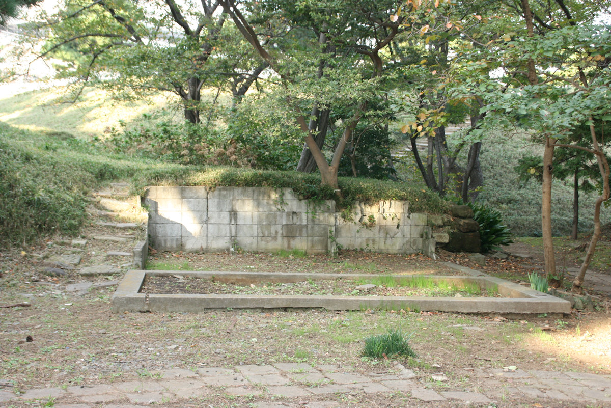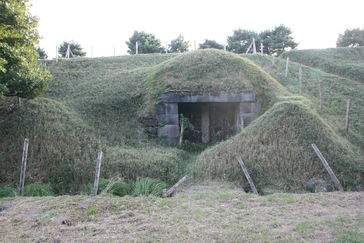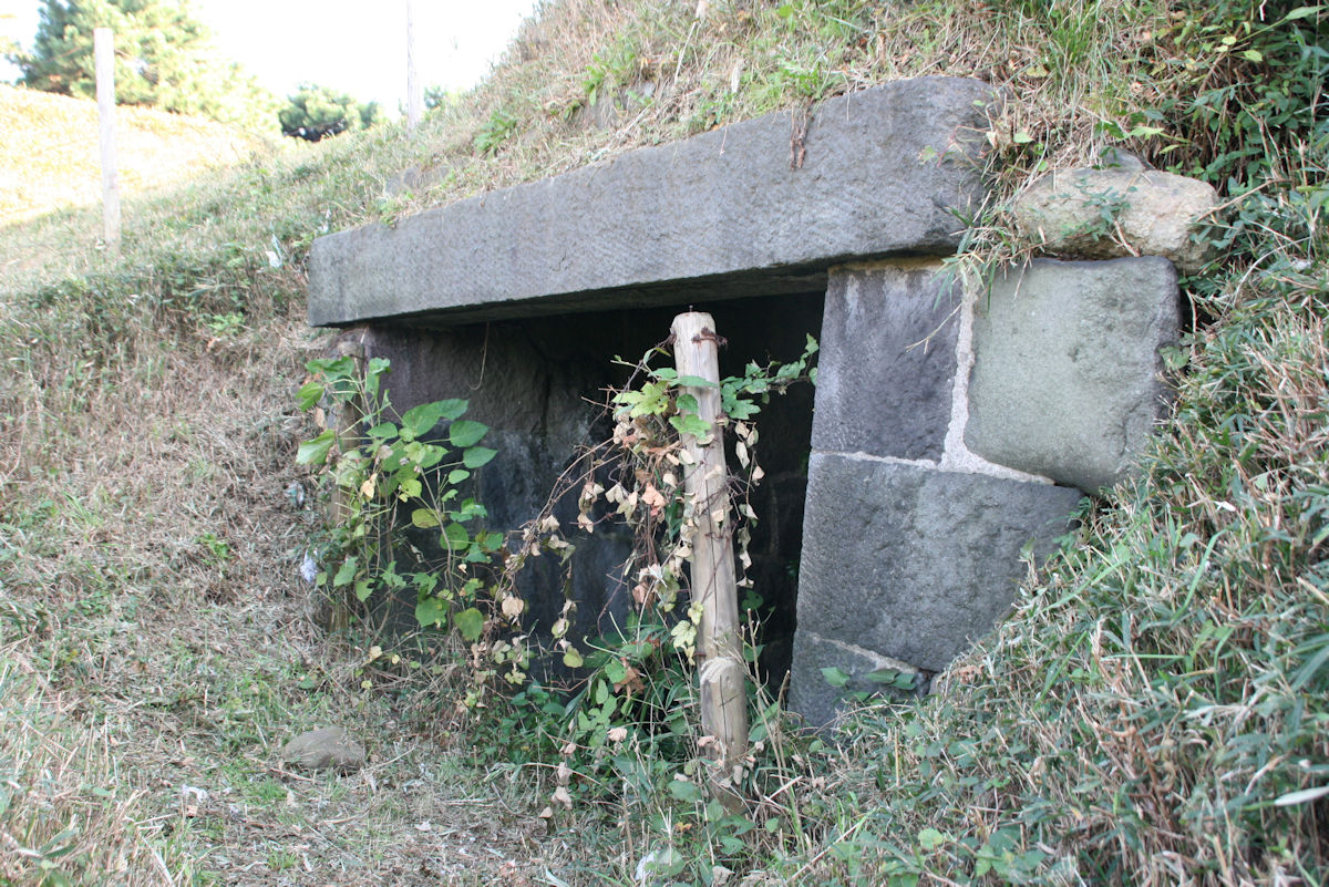 さて、この斜面を降りていくと、そこには弾薬庫が二つあります。石積みとコンクリートの構造物ですが、公園入口近くに玉薬置所(弾薬庫)の跡があります。