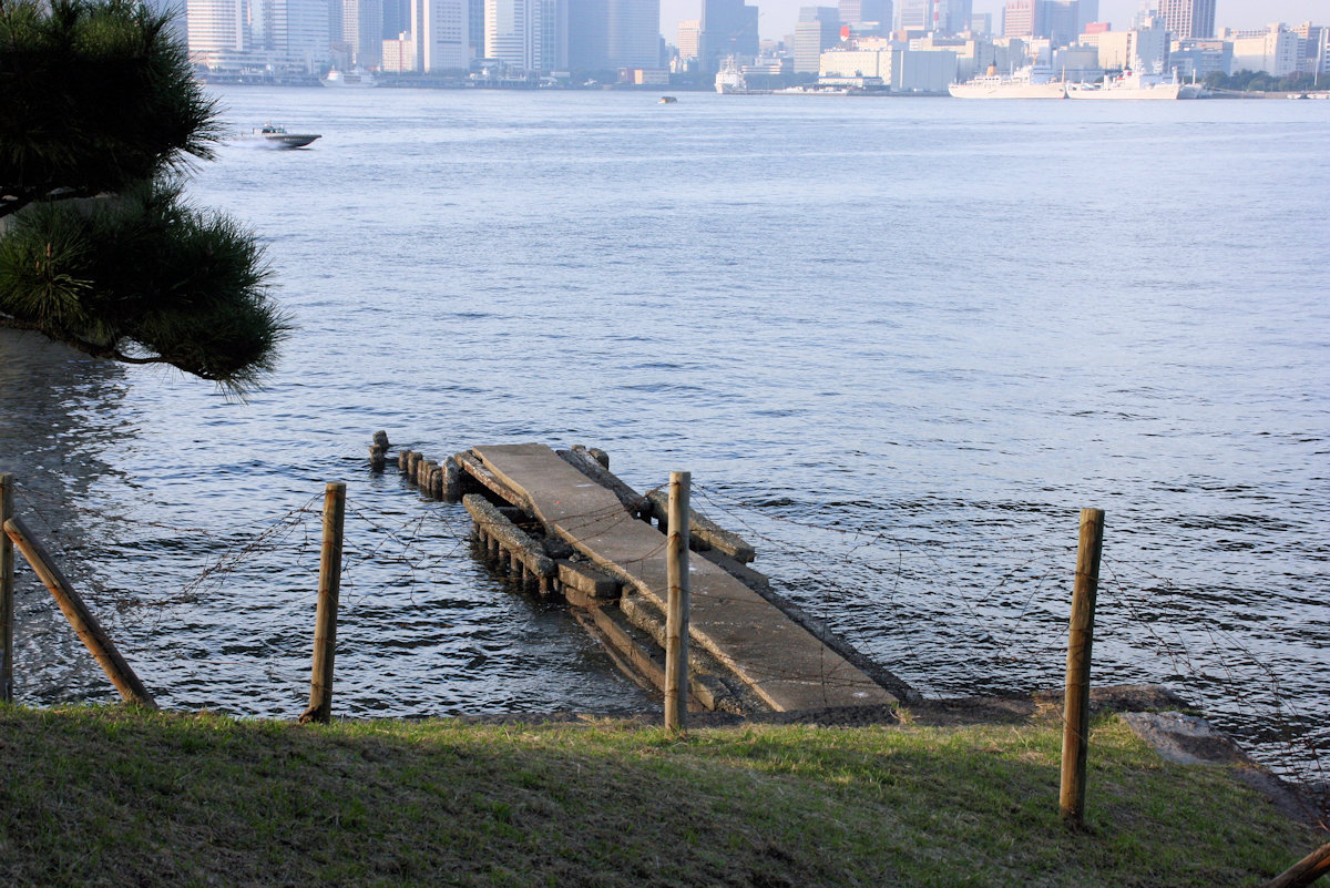 このレインボー・ブリッジ側に船着場があります。下の写真のようなものが突き出ているのがそうです。船着場からの撮影は、現在では出来ないのでインターネットから拝借しました。