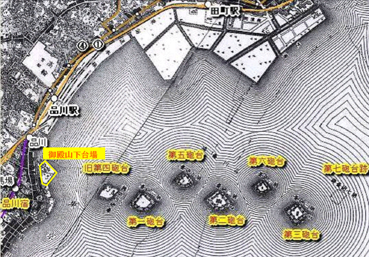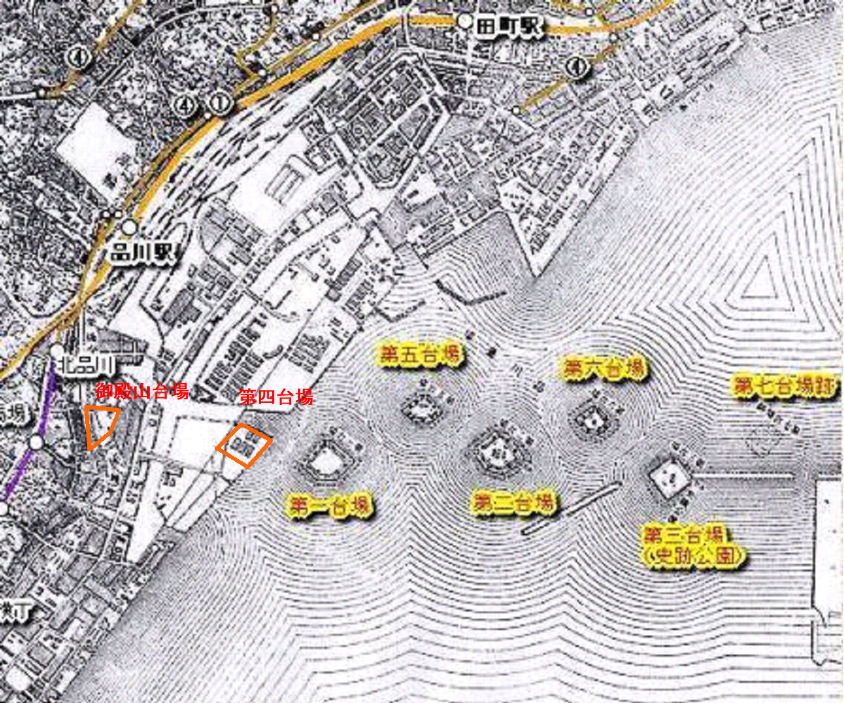 地図は大正8年頃のもの。国土地理院のサイトだったかなあ?ちょいと拝借しました。「御殿山台場」と「第四台場跡」は、うさおが勝手に書き入れたものです。御殿山台場は、今は「品川区立台場小学校」(50品川宿参照)出し、第四台場は天王洲アイルの駅近くです。第一台場、第五台場は、品川ふ頭の中に埋没しています。