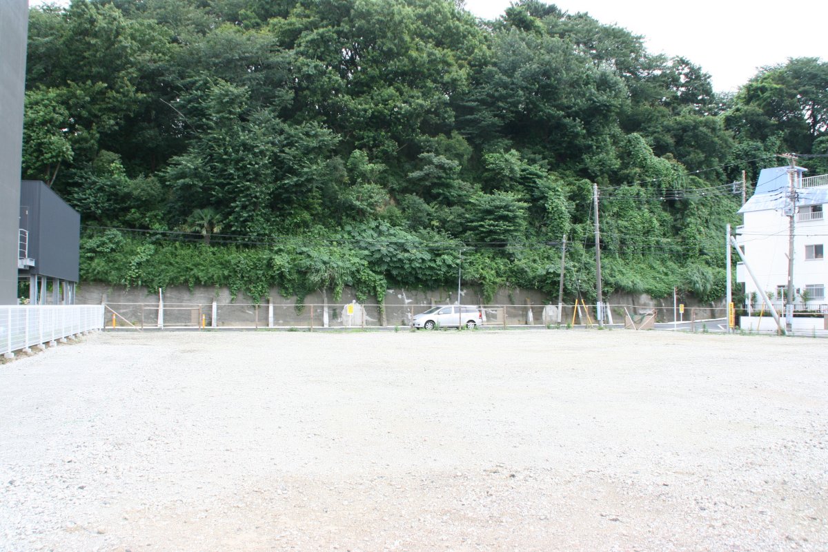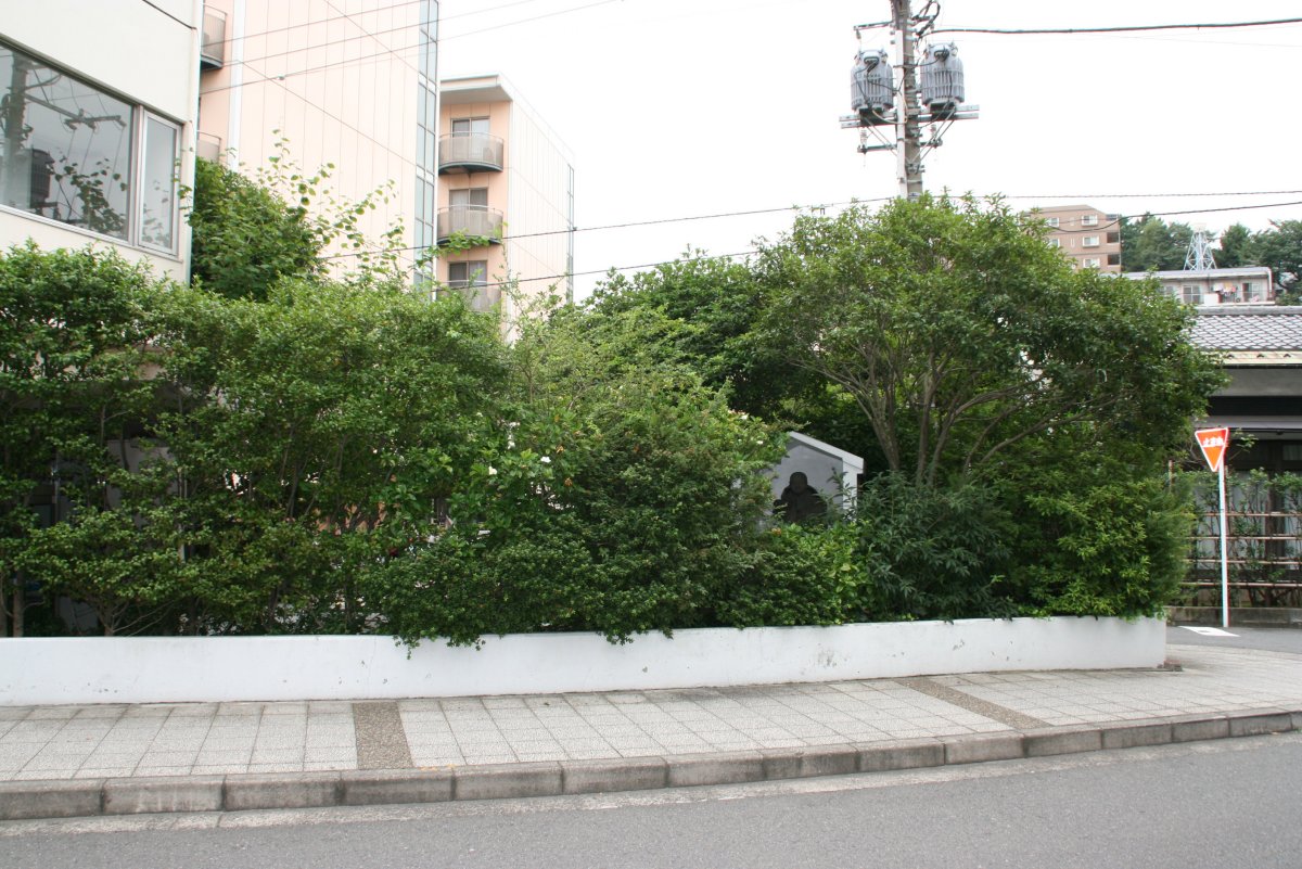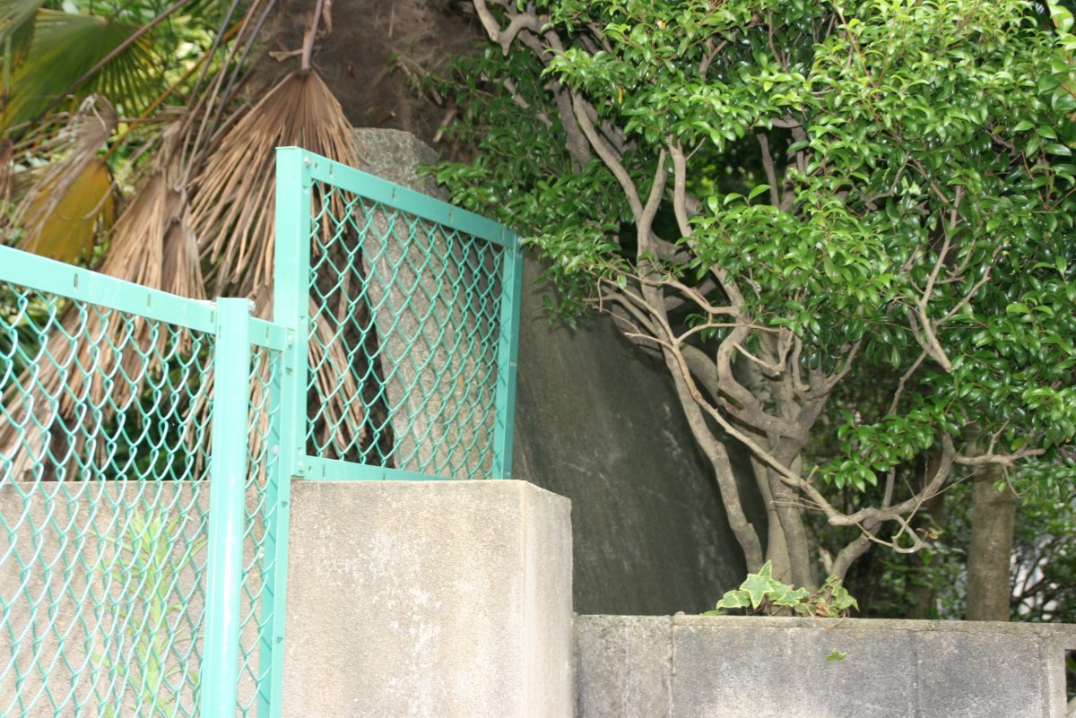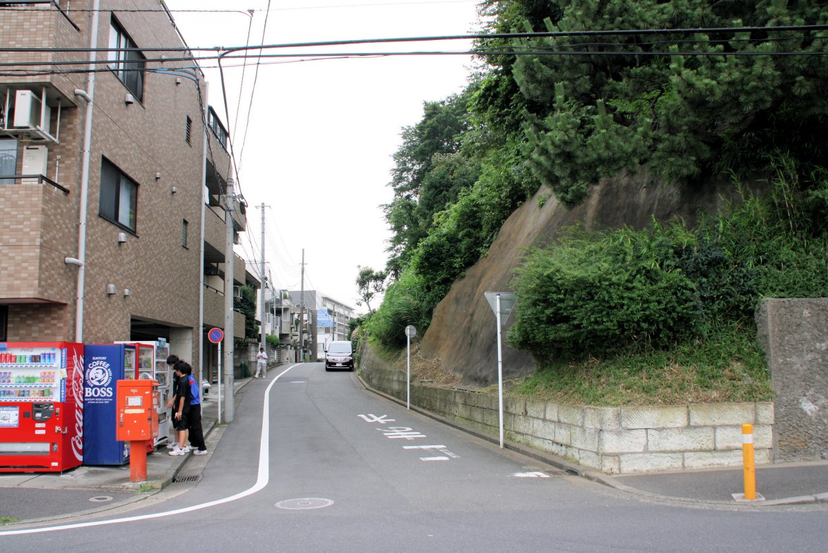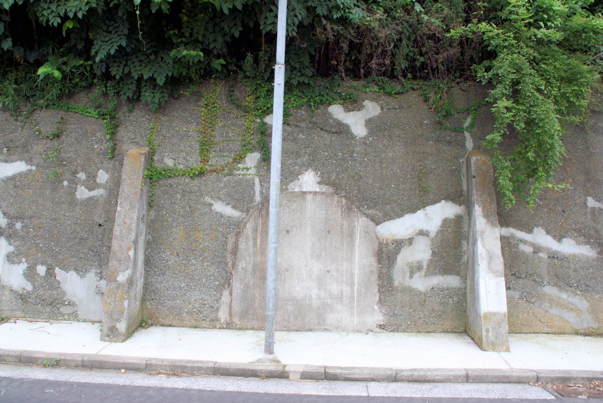 さて、坂を上って日産グランドと横浜マリノスのグランドの間を歩いていくと、東側に浅野学園の丘が見えてくる。この鬱蒼とした森がそれ。着目してほしいのは、道路との境のコンクリート雍壁だ。近づいてみよう。