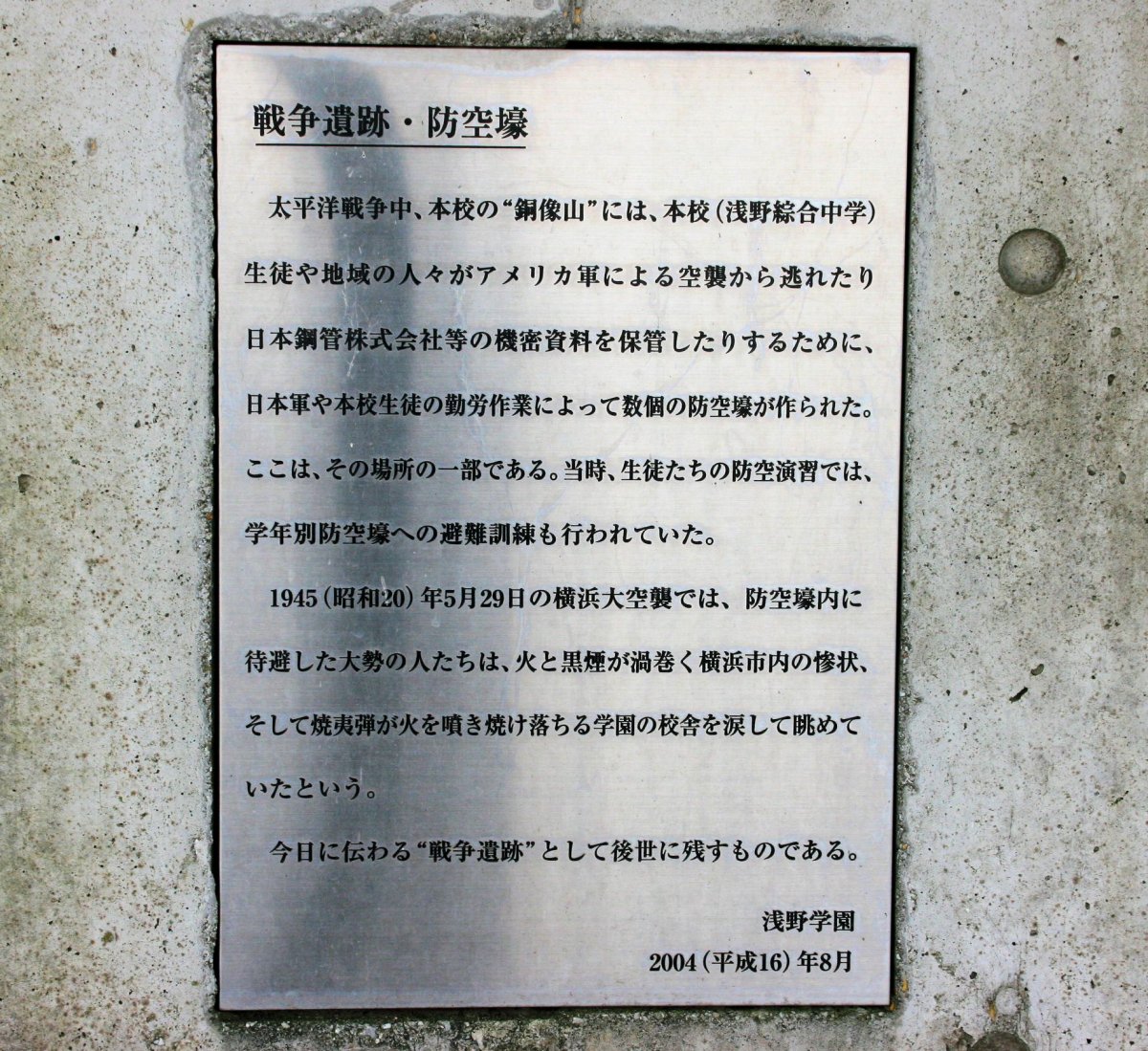 大平洋戦争中、本校の“銅像山”には、本校(浅野綜合中学)生徒や地域の人々がアメリカ軍による空襲から逃れたり日本鋼管株式会社等の機密資料を保管したりするために日本軍や本校生徒の勤労作業によって数個の防空壕が作られた。