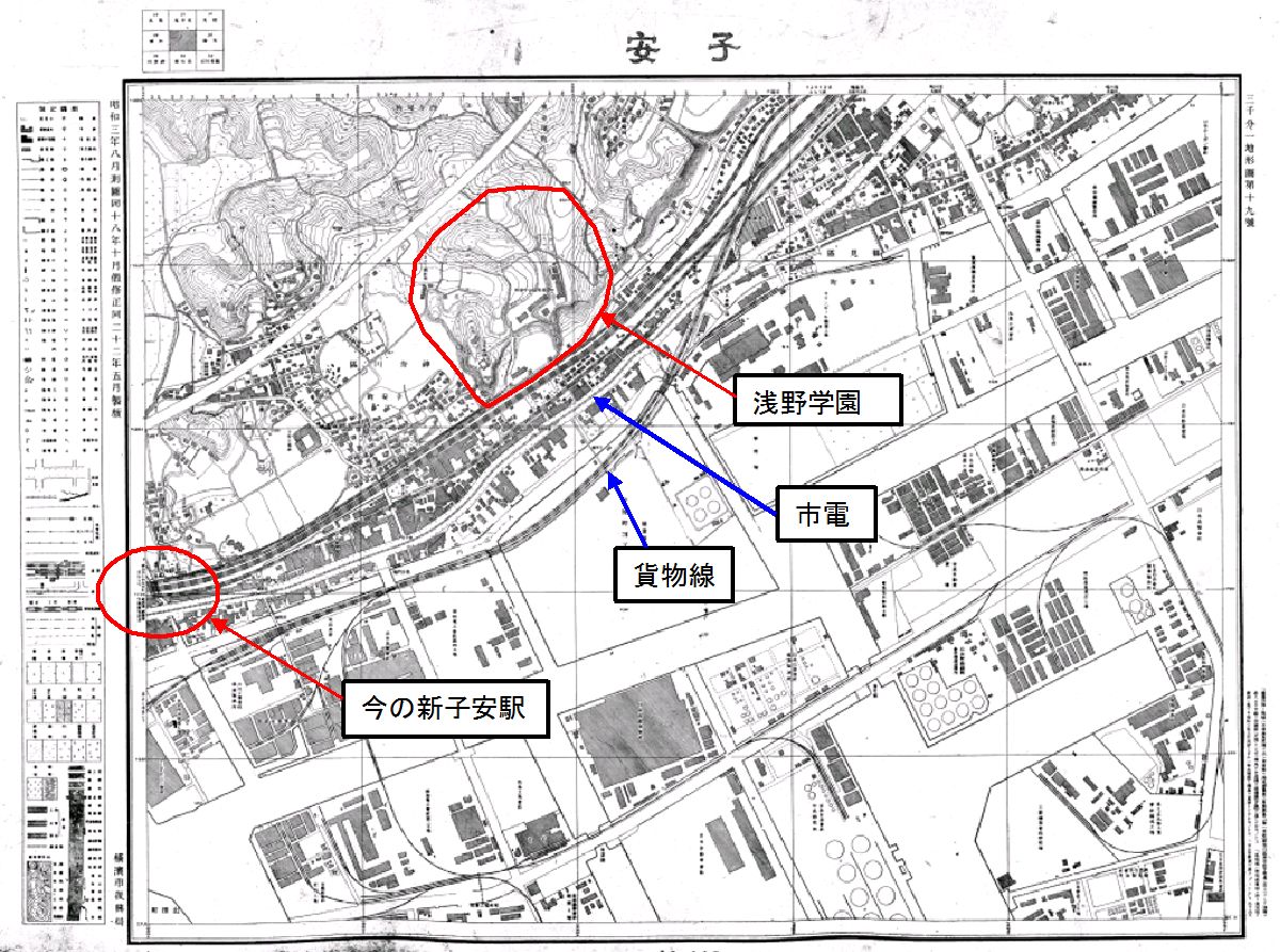 下の写真は終戦直後のものね。黄色の枠内が浅野学園。
