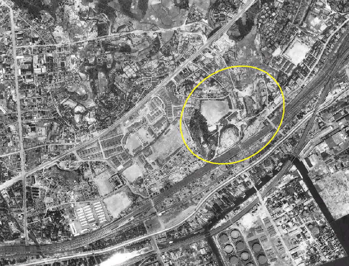 やはり写真は、色が付いている方が学園全体を理解し易い。戦時中も艦砲射撃や空襲にも遭わなかったようだ。学園の中央付近にあるブルーシートのところは、首都高環状2号線の工事中の箇所で、トンネルの坑口になるのだ。破線が首都高の分岐線が延びて来るところだ。