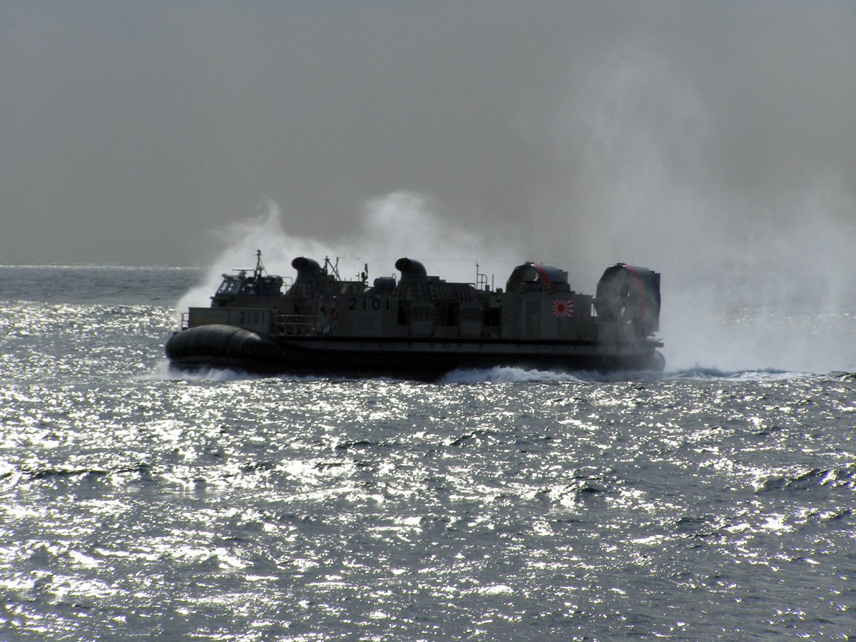 Caccoが何だかよくわからない戦闘艦と言ったが、ホバークラフトです、これは・・・。LCAC(エアークッション艇)は輸送艦「おおすみ」にいつも積まれているものだ。