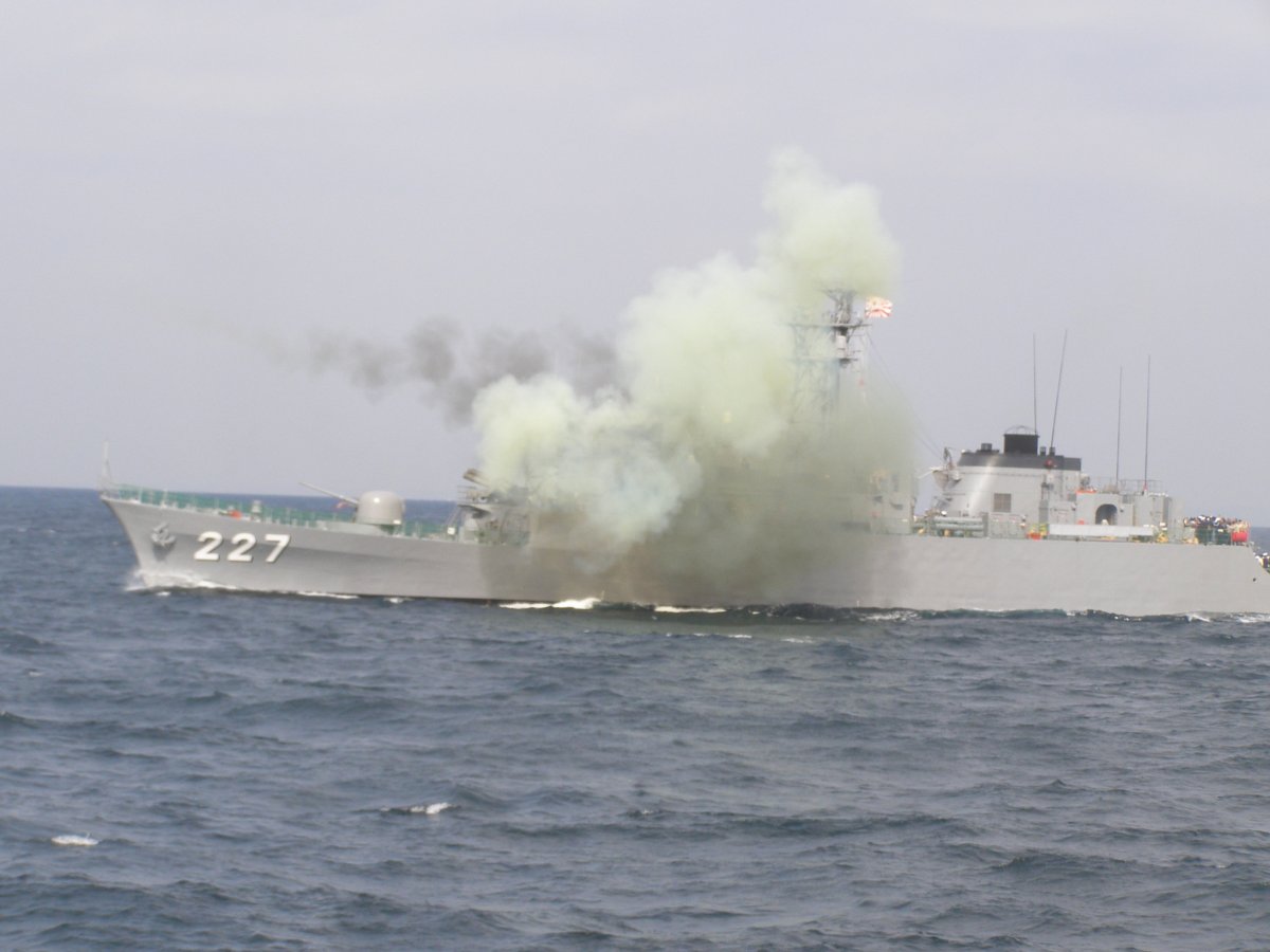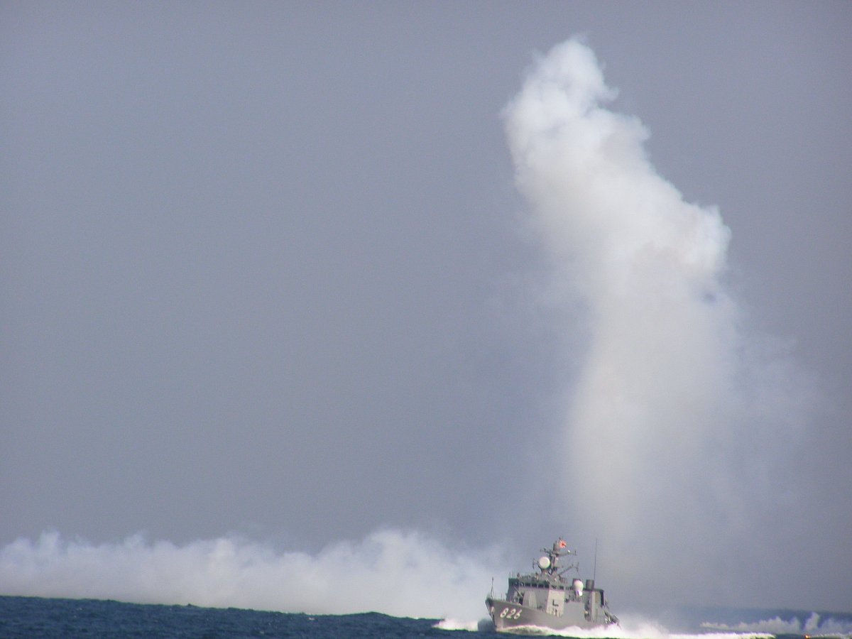 ミサイル艇「おおすみ」からのミサイルの発射だ。ミサイルの軌跡の通りの白煙が上がっている。