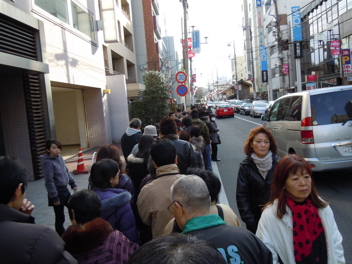 ここだけの話ですが、女性と子供は列にじっと並んで待つことを嫌います。連れがあるとその人に列の順番を託し、物を見に行ったり、食べ物を買ったりするのですが、周りの男性もそれを一様に黙って見ています。文句を言いたそうなのはおばさん達ですが、自分の子供たちもうろうろしているので、ぐっと我慢をしているようです。実はこの遊軍がとっても便利なんですが、少し他人の目が痛いなあ。