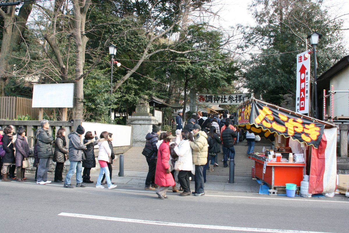さて、調神社の行列に並びます。牛歩すること一時間半、ようやく境内へ入りました。入り口には二羽のウサギが狛犬よろしく睨みを利かせています。う~ん、迫力無いなあ。