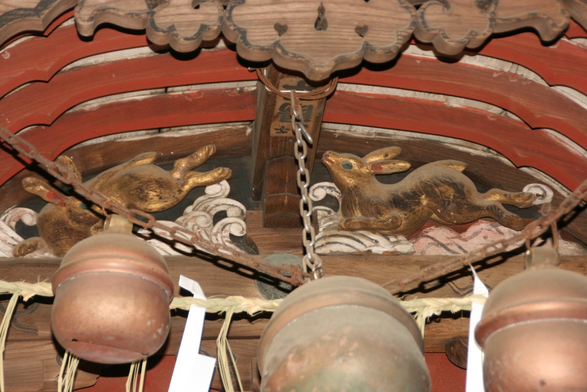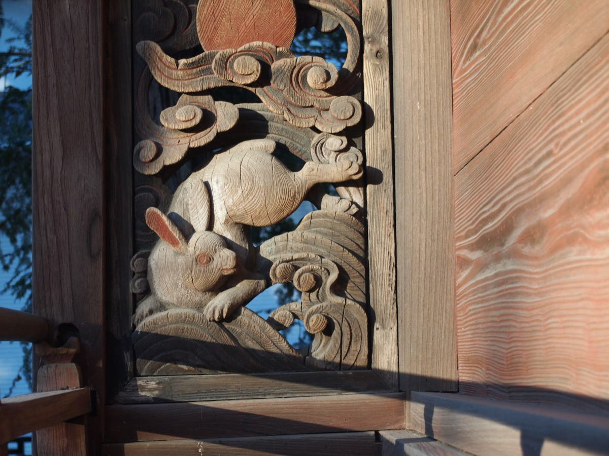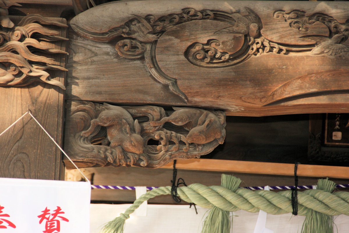 本殿と同じ正面の額の付近に跳ねているウサギが二羽彫られていました。左側のウサギはウナギ犬みたいでぬるっとしていて、浦和っぽいものでした。おおっ、ウサギとウナギ、何となく似ている。
