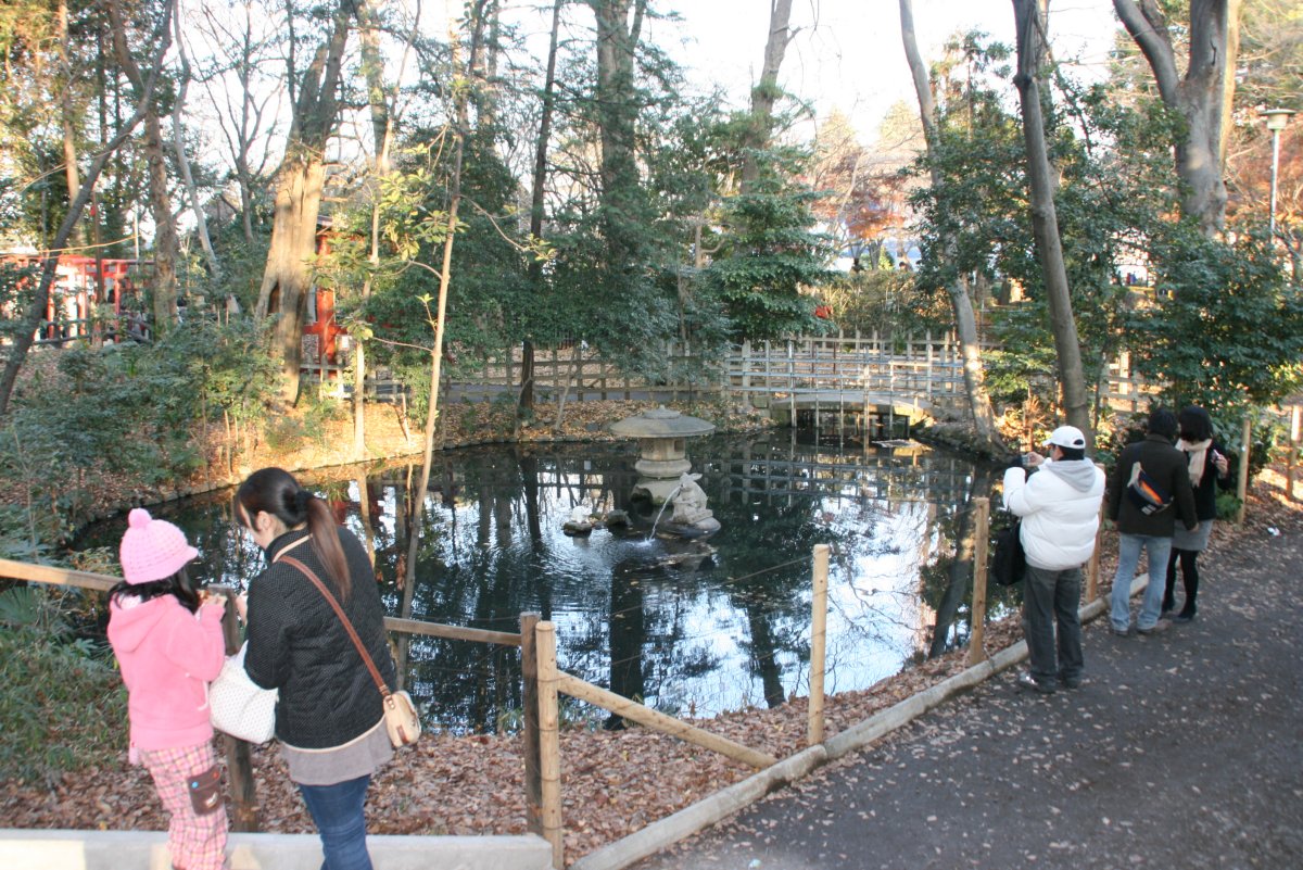 裏に回って見ると池があった。皆さんがカメラを向けている。何があるンだ?