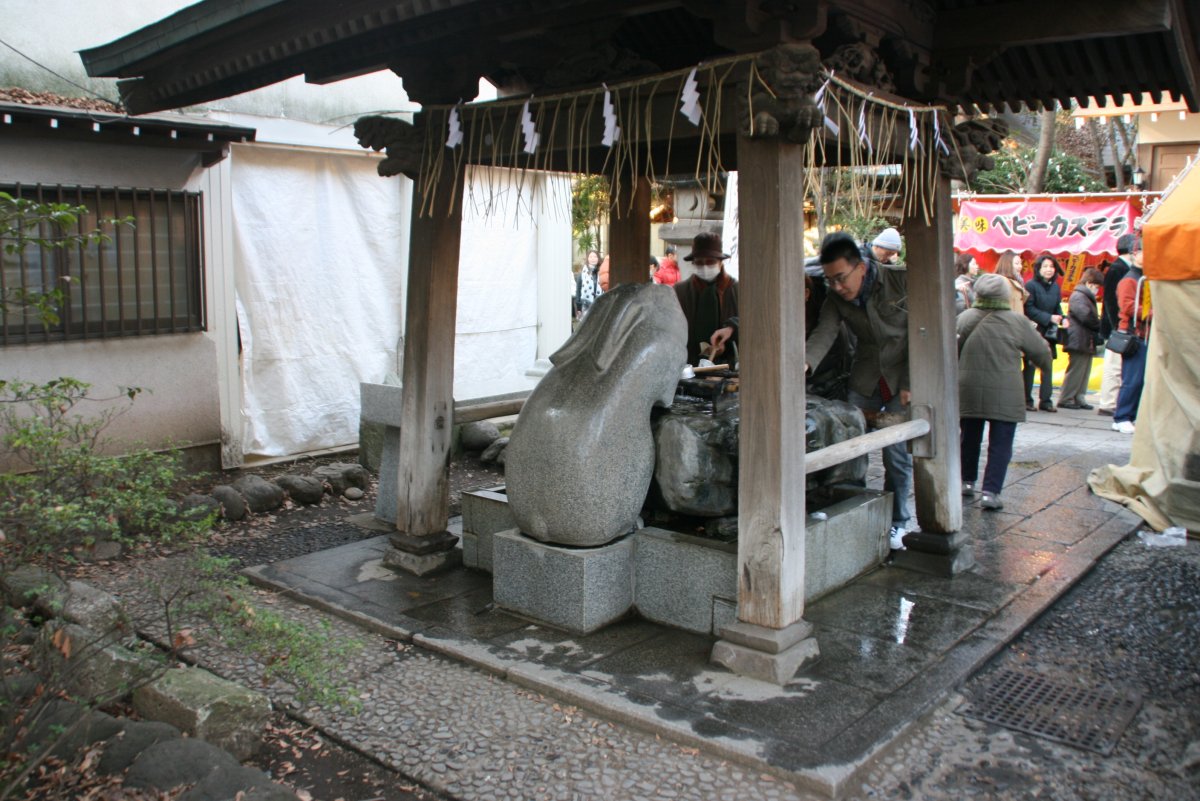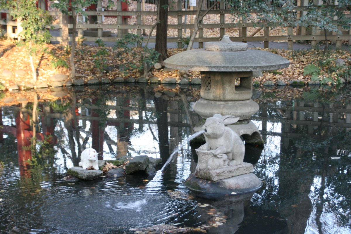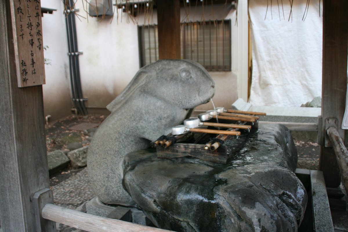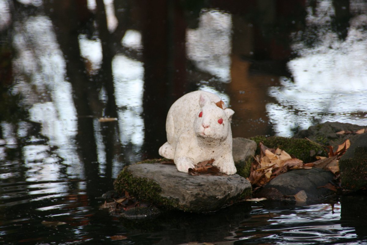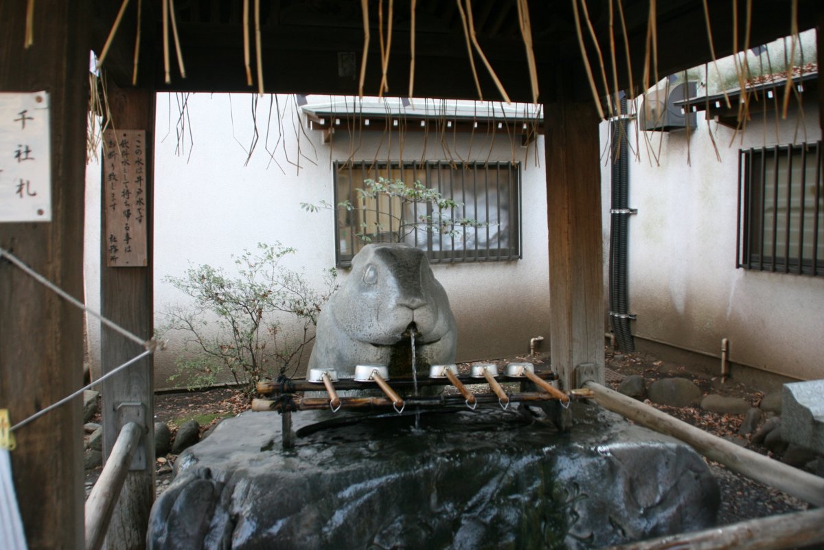 この手水場にも大きなウサギがいます。こいつがひしゃくで水を汲んでくれます。「どうぞっ」