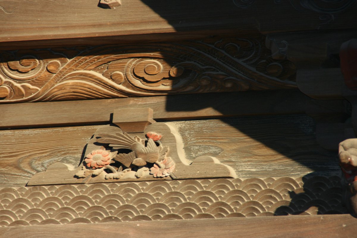 江戸時代のものと言われていますし、この本殿がオリジナルと聞いていますので、数百年経った彫り物ですね。風雨に晒されている割には、色も形もはっきり残っており素晴らしいです。